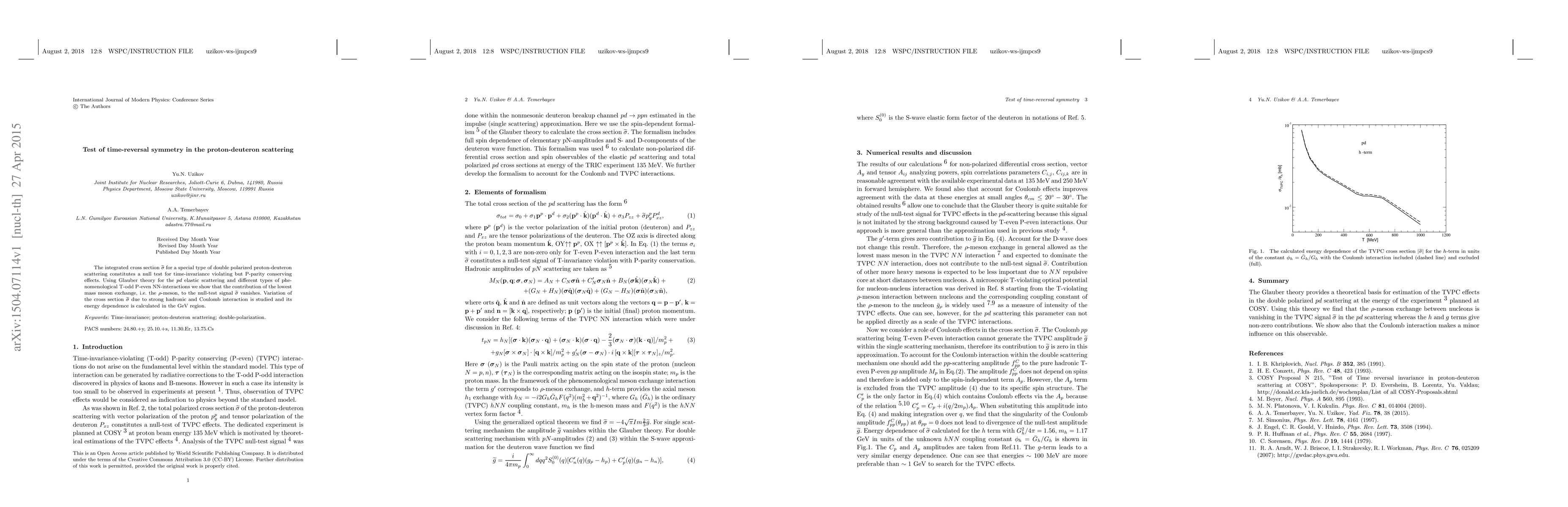This paper investigates the integrated cross section for double polarized proton-deuteron scattering to test for time-invariance violating but P-parity conserving effects, finding that the $\rho$-meson contribution vanishes. It also examines the variation of the cross section due to strong interactions and calculates its energy dependence in the GeV region.