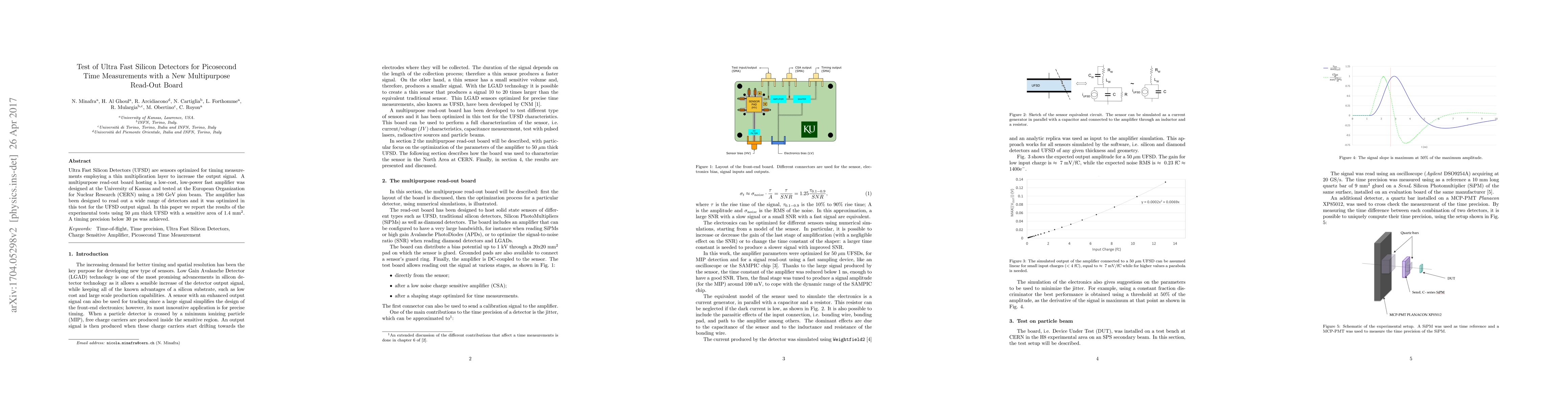 Ultra Fast Silicon Detectors (UFSD) are sensors optimized for timing measurements employing a thin multiplication layer to increase the output signal. A multipurpose read-out board hosting a low-cost, low-power fast amplifier was designed at the University of Kansas and tested at the European Organization for Nuclear Research (CERN) using a 180 GeV pion beam. The amplifier has been designed to read out a wide range of detectors and it was optimized in this test for the UFSD output signal. In this paper we report the results of the experimental tests using 50 $\rm{\mu m}$ thick UFSD with a sensitive area of 1.4 $\rm{mm^2}$. A timing precision below 30 ps was achieved.