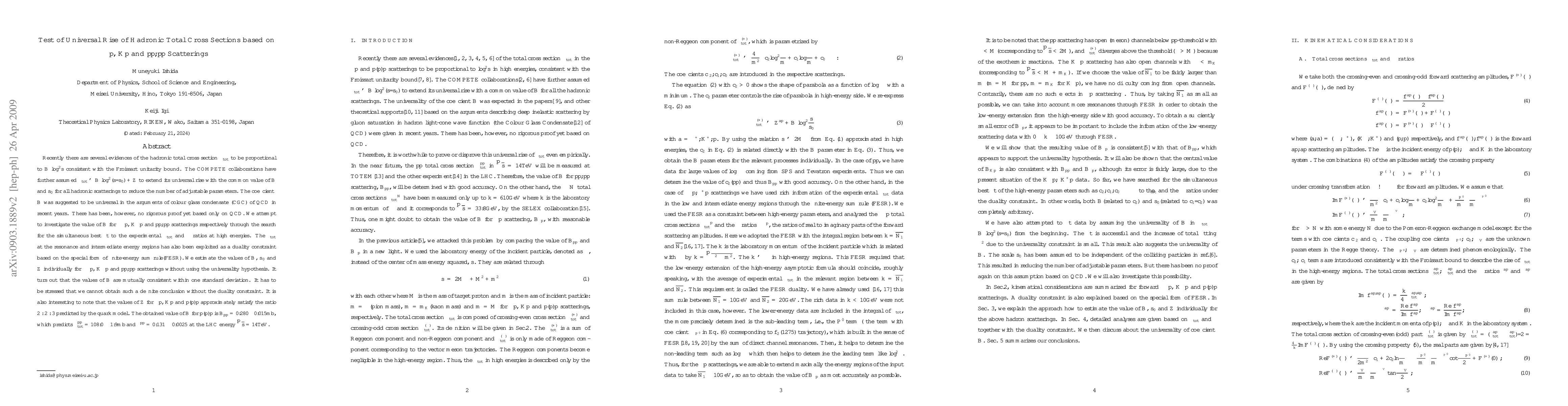 This paper investigates the universal rise of hadronic total cross sections for pi-p, K+-p, and pbar-p,pp scatterings, finding consistent values for the coefficient B within one standard deviation across different scattering processes. The study emphasizes the importance of duality constraints and finite-energy sum rules in deriving these values, with Bpp for pbar-p,pp scattering estimated as 0.280 ± 0.015 mb.