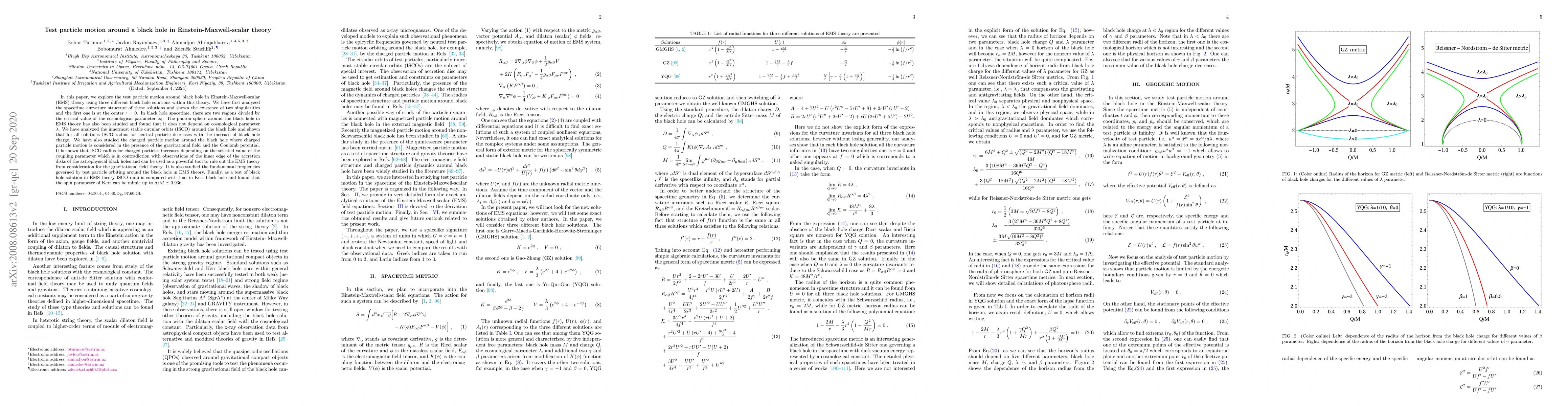 In this paper, we explore the test particle motion around a black hole in Einstein-Maxwell-scalar (EMS) theory using three different black hole solutions within this theory. We have first analyzed the spacetime curvature structure of these solutions and shown the existence of two singularities and the first one is at the center $r=0$. In black hole spacetime, there are two regions divided by the critical value of the cosmological parameter $\lambda_0$. The photon sphere around the black hole in EMS theory has also been studied and found that it does not depend on cosmological parameter $\lambda$. We have analyzed the innermost stable circular orbits (ISCO) around the black hole and shown that for all solutions ISCO radius for neutral particle decreases with the increase of black hole charge. We have also studied the charged particle motion around the black hole where charged particle motion is considered in the presence of the gravitational field and the Coulomb potential. It is shown that ISCO radius for charged particles increases depending on the selected value of the coupling parameter which is in contradiction with observations of the inner edge of the accretion disks of the astrophysical black holes and can be used as a powerful tool to rule out the EMS theory from consideration for the gravitational field theory. It is also studied the fundamental frequencies governed by test particle orbiting around the black hole in EMS theory. Finally, as a test of black hole solution in EMS theory ISCO radii is compared with that in Kerr black hole and found that the spin parameter of Kerr can be mimic up to $a/M\simeq 0.936$.