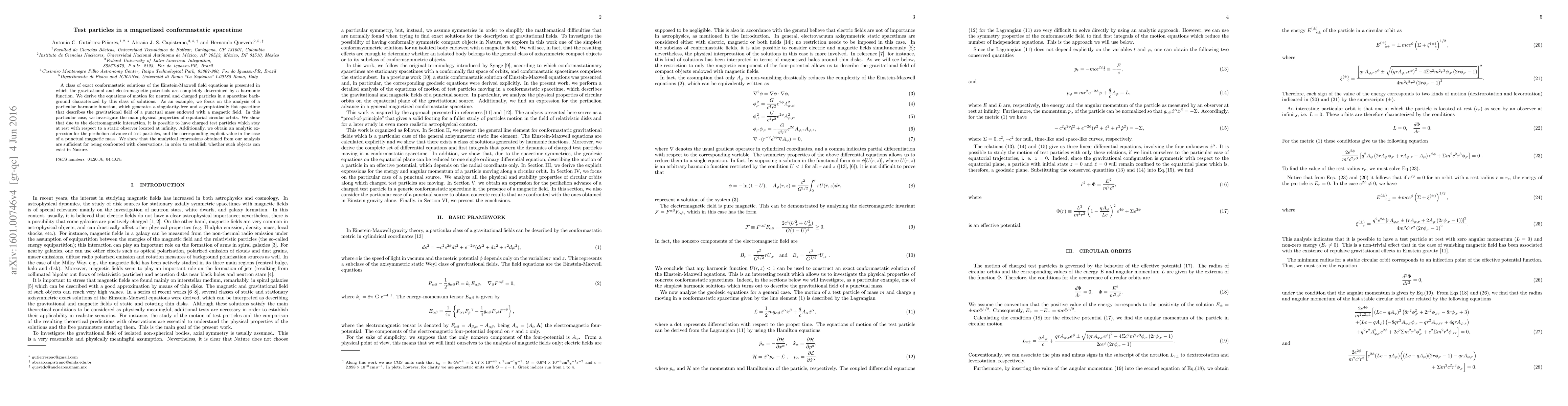 A class of exact conformastatic solutions of the Einstein-Maxwell field equations is presented in which the gravitational and electromagnetic potentials are completely determined by a harmonic function. We derive the equations of motion for neutral and charged particles in a spacetime background characterized by this class of solutions. As an example, we focus on the analysis of a particular harmonic function, which generates a singularity-free and asymptotically flat spacetime that describes the gravitational field of a punctual mass endowed with a magnetic field. In this particular case, we investigate the main physical properties of equatorial circular orbits. We show that due to the electromagnetic interaction, it is possible to have charged test particles which stay at rest with respect to a static observer located at infinity. Additionally, we obtain an analytic expression for the perihelion advance of test particles and the corresponding explicit value in the case of a punctual magnetic mass. We show that the analytical expressions obtained from our analysis are sufficient for being confronted with observations in order to establish whether such objects can exist in nature.