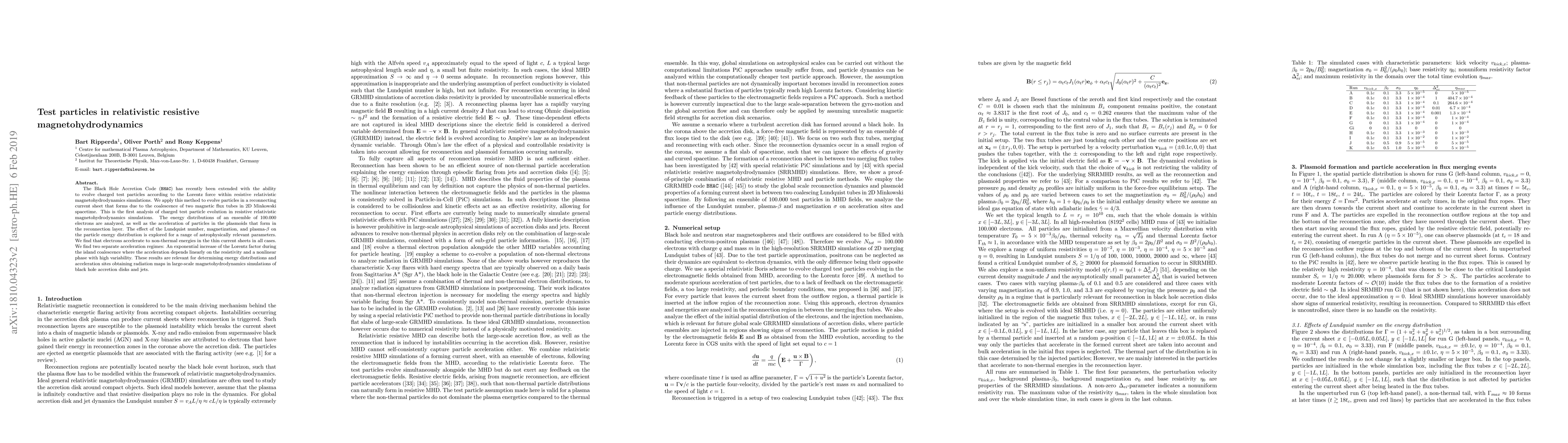 This paper extends the Black Hole Accretion Code (BHAC) to simulate charged particles in resistive relativistic magnetohydrodynamics, analyzing electron acceleration in reconnecting current sheets. The study reveals two distinct acceleration regimes and highlights the impact of resistivity, magnetization, and plasma-$\beta$ on particle energy distributions, providing insights for understanding radiation in black hole accretion disks and jets.