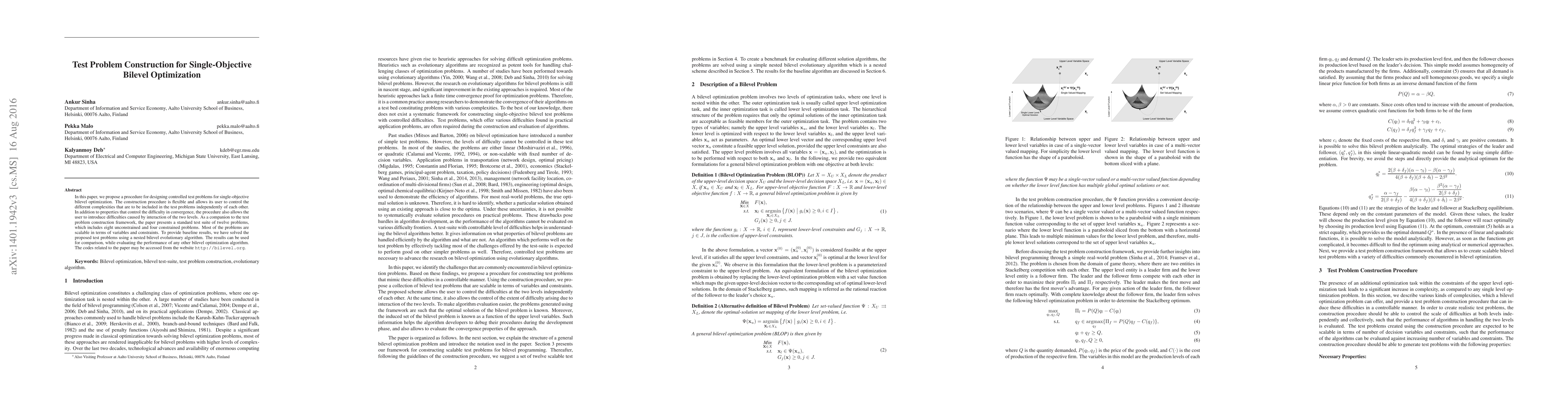 This paper introduces a flexible procedure for constructing controlled test problems for single-objective bilevel optimization, allowing independent control over various complexities. It also presents a standard test suite of twelve problems, solvable using a nested bilevel evolutionary algorithm, to benchmark the performance of other bilevel optimization algorithms.