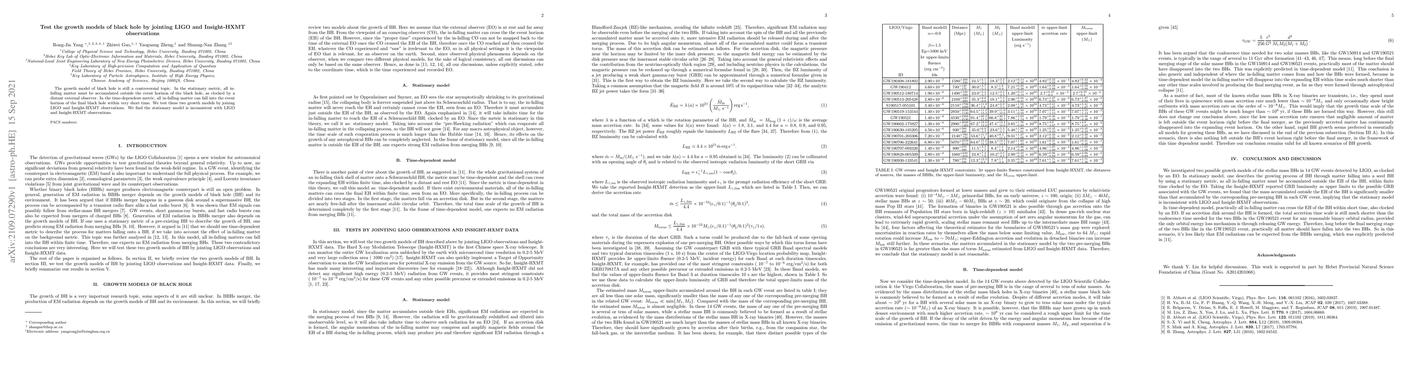 The paper tests two black hole growth models using LIGO and Insight-HXMT observations, finding that the stationary model is inconsistent with the data.