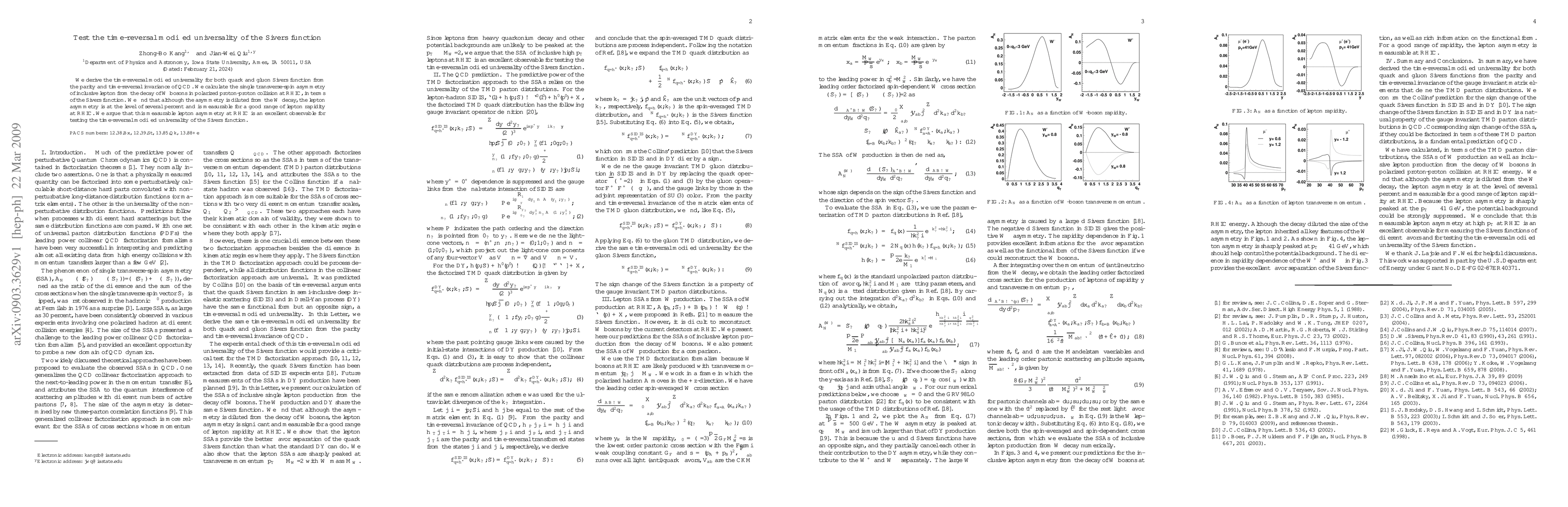 We derive the time-reversal modified universality for both quark and gluon Sivers function from the parity and time-reversal invariance of QCD. We calculate the single transverse-spin asymmetry of inclusive lepton from the decay of $W$ bosons in polarized proton-proton collision at RHIC, in terms of the Sivers function. We find that although the asymmetry is diluted from the $W$ decay, the lepton asymmetry is at the level of several percent and is measurable for a good range of lepton rapidity at RHIC. We argue that this measurable lepton asymmetry at RHIC is an excellent observable for testing the time-reversal modified universality of the Sivers function.
