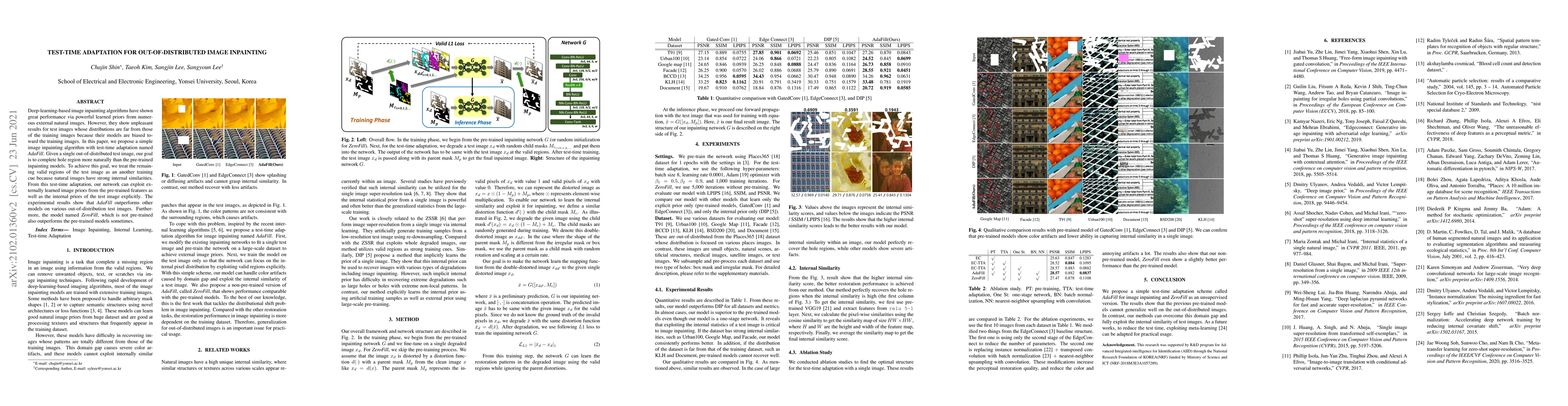 Deep learning-based image inpainting algorithms have shown great performance via powerful learned prior from the numerous external natural images. However, they show unpleasant results on the test image whose distribution is far from the that of training images because their models are biased toward the training images. In this paper, we propose a simple image inpainting algorithm with test-time adaptation named AdaFill. Given a single out-of-distributed test image, our goal is to complete hole region more naturally than the pre-trained inpainting models. To achieve this goal, we treat remained valid regions of the test image as another training cues because natural images have strong internal similarities. From this test-time adaptation, our network can exploit externally learned image priors from the pre-trained features as well as the internal prior of the test image explicitly. Experimental results show that AdaFill outperforms other models on the various out-of-distribution test images. Furthermore, the model named ZeroFill, that are not pre-trained also sometimes outperforms the pre-trained models.