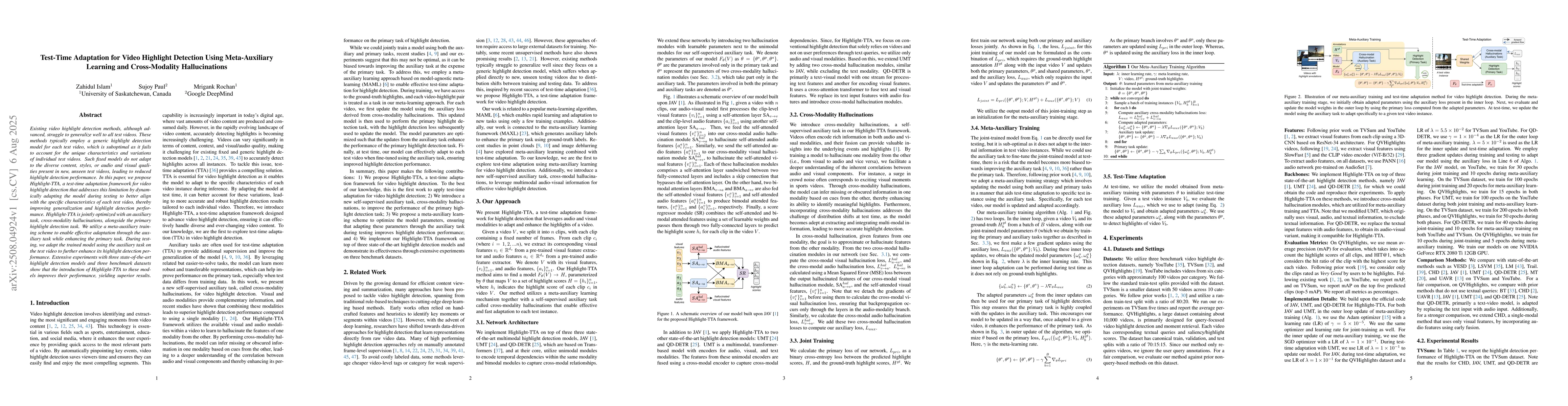 Existing video highlight detection methods, although advanced, struggle to generalize well to all test videos. These methods typically employ a generic highlight detection model for each test video, which is suboptimal as it fails to account for the unique characteristics and variations of individual test videos. Such fixed models do not adapt to the diverse content, styles, or audio and visual qualities present in new, unseen test videos, leading to reduced highlight detection performance. In this paper, we propose Highlight-TTA, a test-time adaptation framework for video highlight detection that addresses this limitation by dynamically adapting the model during testing to better align with the specific characteristics of each test video, thereby improving generalization and highlight detection performance. Highlight-TTA is jointly optimized with an auxiliary task, cross-modality hallucinations, alongside the primary highlight detection task. We utilize a meta-auxiliary training scheme to enable effective adaptation through the auxiliary task while enhancing the primary task. During testing, we adapt the trained model using the auxiliary task on the test video to further enhance its highlight detection performance. Extensive experiments with three state-of-the-art highlight detection models and three benchmark datasets show that the introduction of Highlight-TTA to these models improves their performance, yielding superior results.