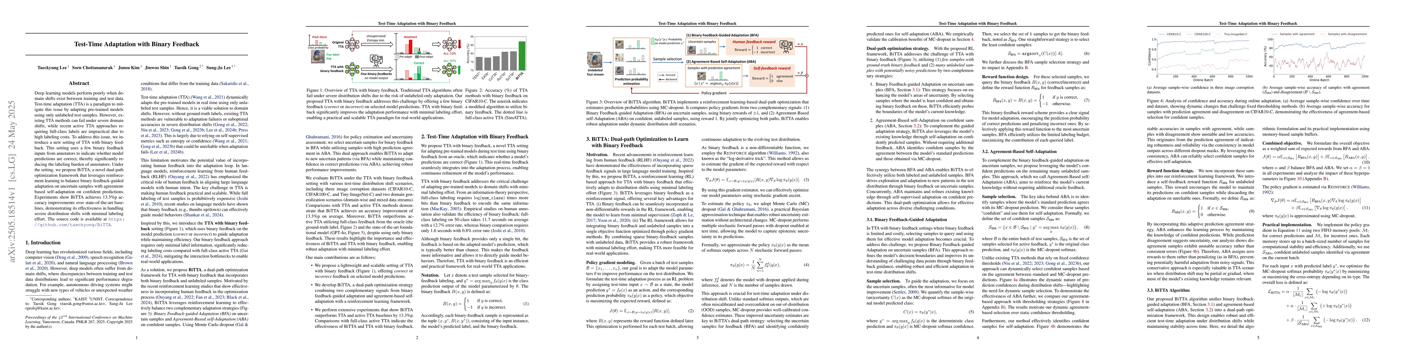 This work introduces a new setting of test-time adaptation with binary feedback, distinguishing itself from existing methods that either require full-class labels or fail under severe domain shifts.