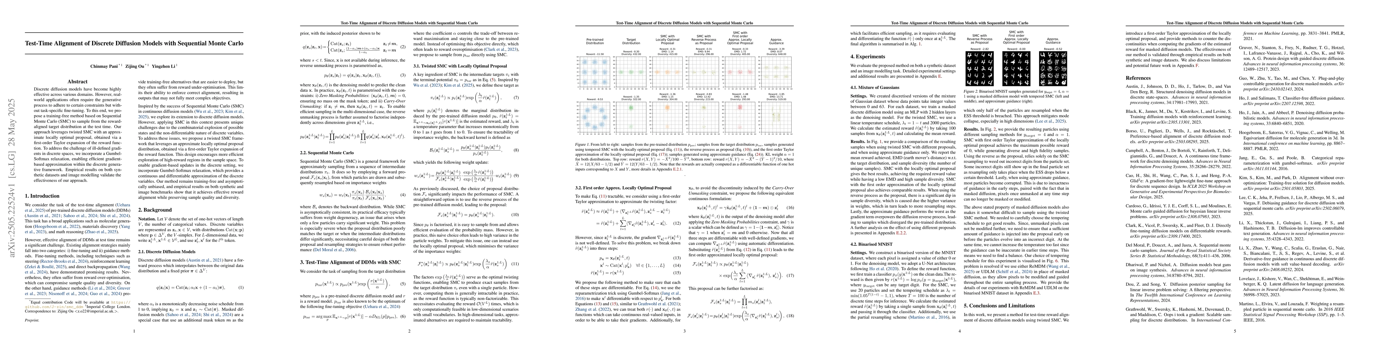 A new method uses Sequential Monte Carlo to sample from a reward-aligned target distribution at test time, allowing discrete diffusion models to adhere to constraints without fine-tuning.