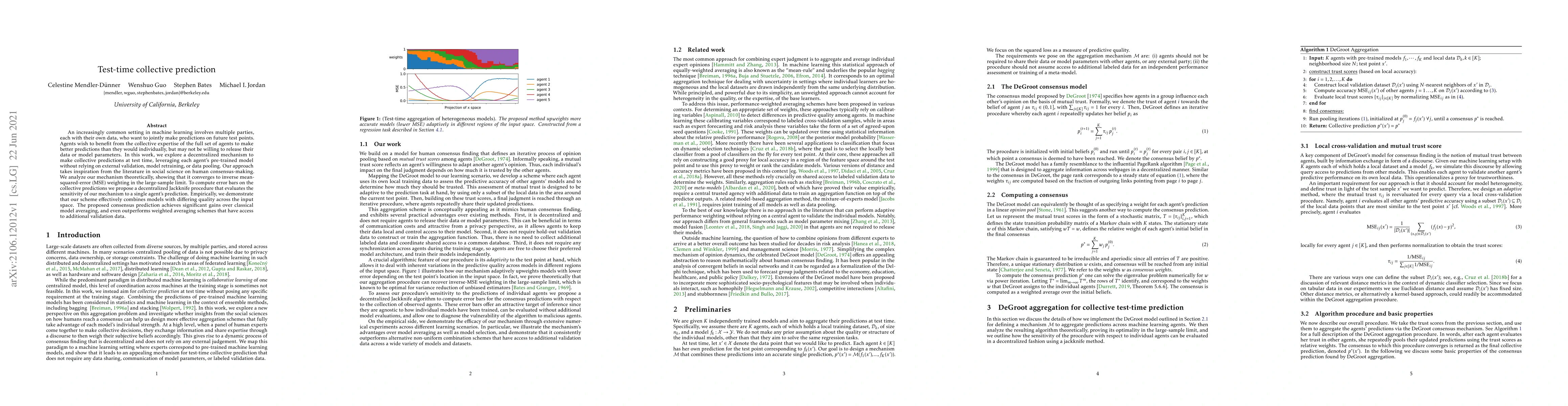An increasingly common setting in machine learning involves multiple parties, each with their own data, who want to jointly make predictions on future test points. Agents wish to benefit from the collective expertise of the full set of agents to make better predictions than they would individually, but may not be willing to release their data or model parameters. In this work, we explore a decentralized mechanism to make collective predictions at test time, leveraging each agent's pre-trained model without relying on external validation, model retraining, or data pooling. Our approach takes inspiration from the literature in social science on human consensus-making. We analyze our mechanism theoretically, showing that it converges to inverse meansquared-error (MSE) weighting in the large-sample limit. To compute error bars on the collective predictions we propose a decentralized Jackknife procedure that evaluates the sensitivity of our mechanism to a single agent's prediction. Empirically, we demonstrate that our scheme effectively combines models with differing quality across the input space. The proposed consensus prediction achieves significant gains over classical model averaging, and even outperforms weighted averaging schemes that have access to additional validation data.