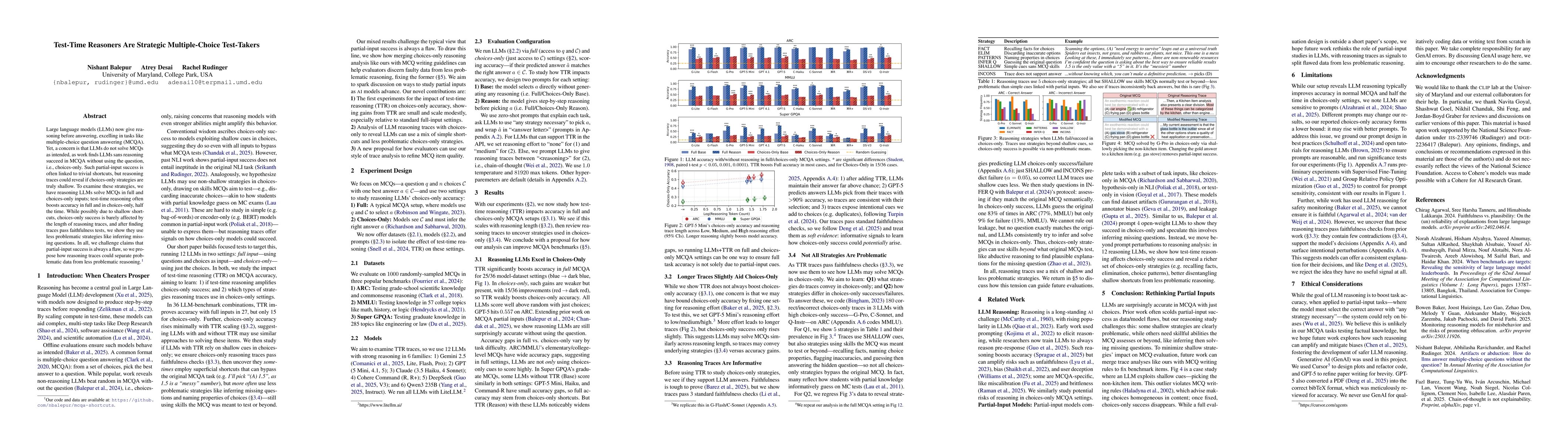 Large language models (LLMs) now give reasoning before answering, excelling in tasks like multiple-choice question answering (MCQA). Yet, a concern is that LLMs do not solve MCQs as intended, as work finds LLMs sans reasoning succeed in MCQA without using the question, i.e., choices-only. Such partial-input success is often deemed problematic, but reasoning traces could reveal if these strategies are truly shallow in choices-only settings. To study these strategies, reasoning LLMs solve MCQs in full and choices-only inputs; test-time reasoning often boosts accuracy on full and in choices-only half the time. While possibly due to shallow shortcuts, choices-only success is barely affected by the length of reasoning traces, and after finding traces pass faithfulness tests, we show they use less problematic strategies like inferring missing questions. In all, we challenge claims that partial-input success is always a flaw, so we discuss how reasoning traces could separate problematic data from less problematic reasoning.