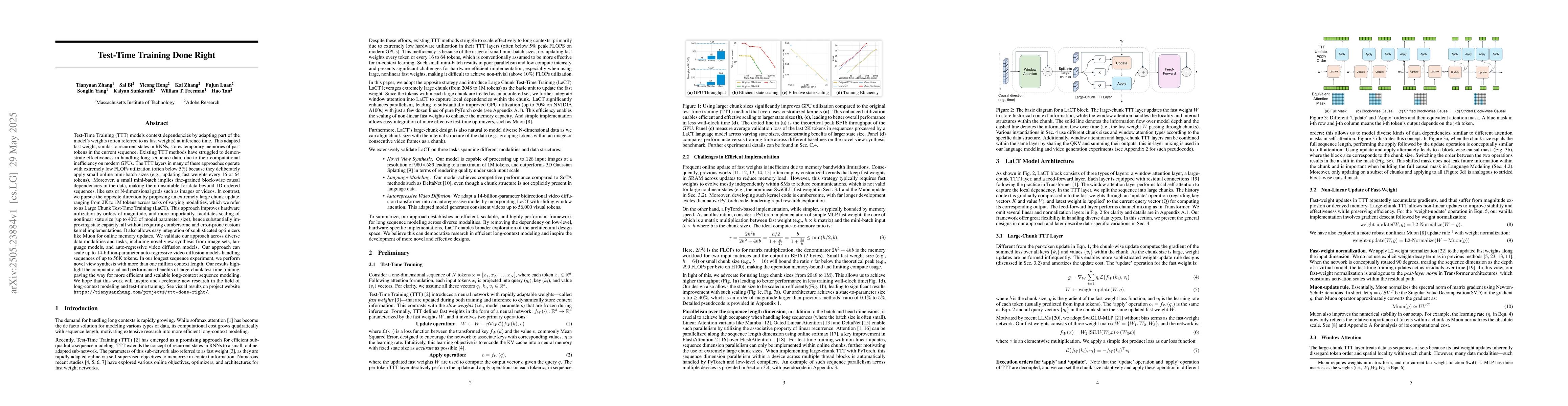This research paper introduces Large Chunk Test-Time Training (LaCT), a method that improves test-time training efficiency by adapting large chunks of model weights during inference, enabling scaling to long-context data and diverse modalities.