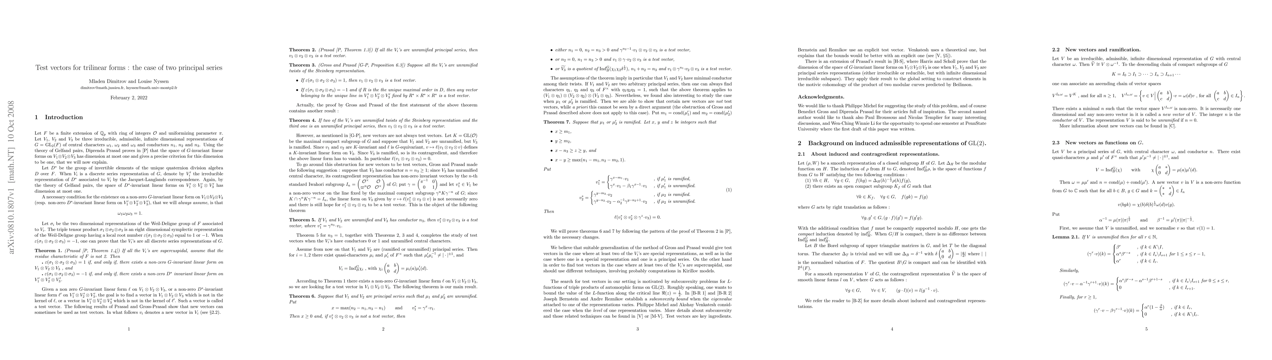 This paper finds explicit test vectors for trilinear forms in the context of GL(2,F), where F is a finite extension of Qp, and two of the three admissible, irreducible, finite-dimensional representations are principal series. It extends previous work by Gross and Prasad on unramified cases.