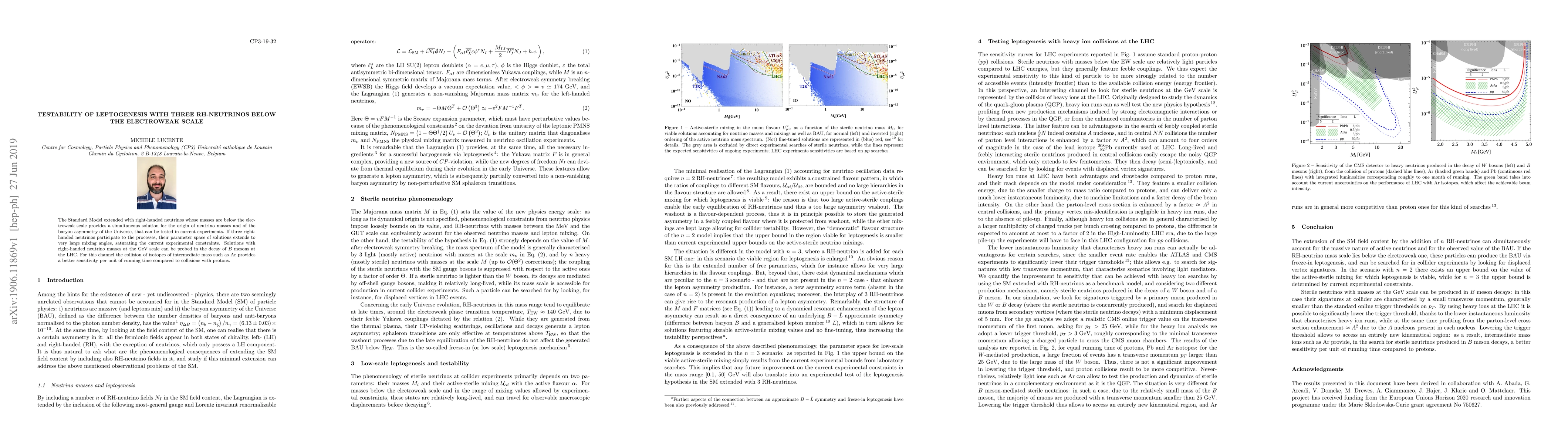 A study explores the testability of leptogenesis with three RH-neutrinos below the electroweak scale, finding that solutions can be probed in B meson decay at the LHC and offering improved sensitivity for isotopic collisions.