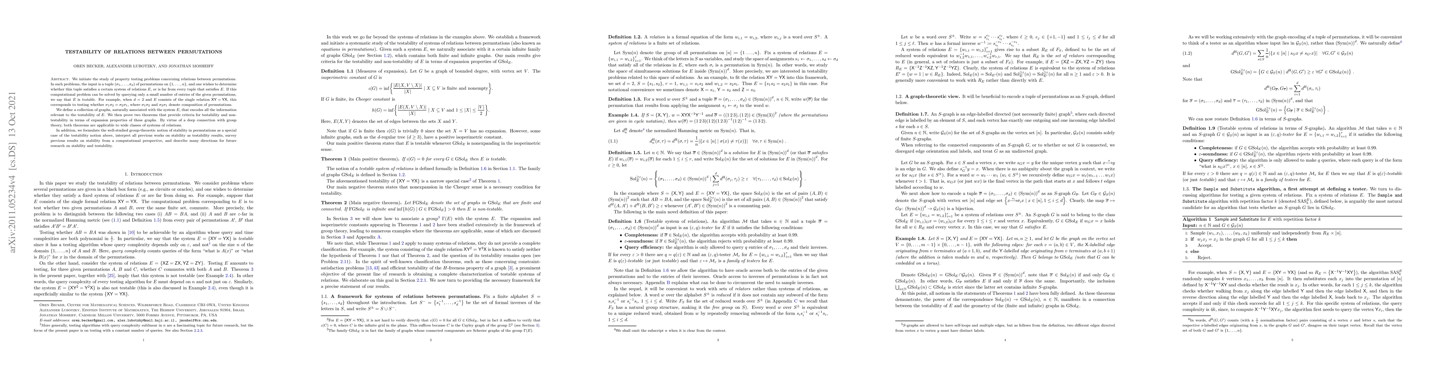 We initiate the study of property testing problems concerning relations between permutations. In such problems, the input is a tuple $(\sigma_1,\dotsc,\sigma_d)$ of permutations on $\{1,\dotsc,n\}$, and one wishes to determine whether this tuple satisfies a certain system of relations $E$, or is far from every tuple that satisfies $E$. If this computational problem can be solved by querying only a small number of entries of the given permutations, we say that $E$ is testable. For example, when $d=2$ and $E$ consists of the single relation $\mathsf{XY=YX}$, this corresponds to testing whether $\sigma_1\sigma_2=\sigma_2\sigma_1$, where $\sigma_1\sigma_2$ and $\sigma_2\sigma_1$ denote composition of permutations. We define a collection of graphs, naturally associated with the system $E$, that encodes all the information relevant to the testability of $E$. We then prove two theorems that provide criteria for testability and non-testability in terms of expansion properties of these graphs. By virtue of a deep connection with group theory, both theorems are applicable to wide classes of systems of relations. In addition, we formulate the well-studied group-theoretic notion of stability in permutations as a special case of the testability notion above, interpret all previous works on stability as testability results, survey previous results on stability from a computational perspective, and describe many directions for future research on stability and testability.