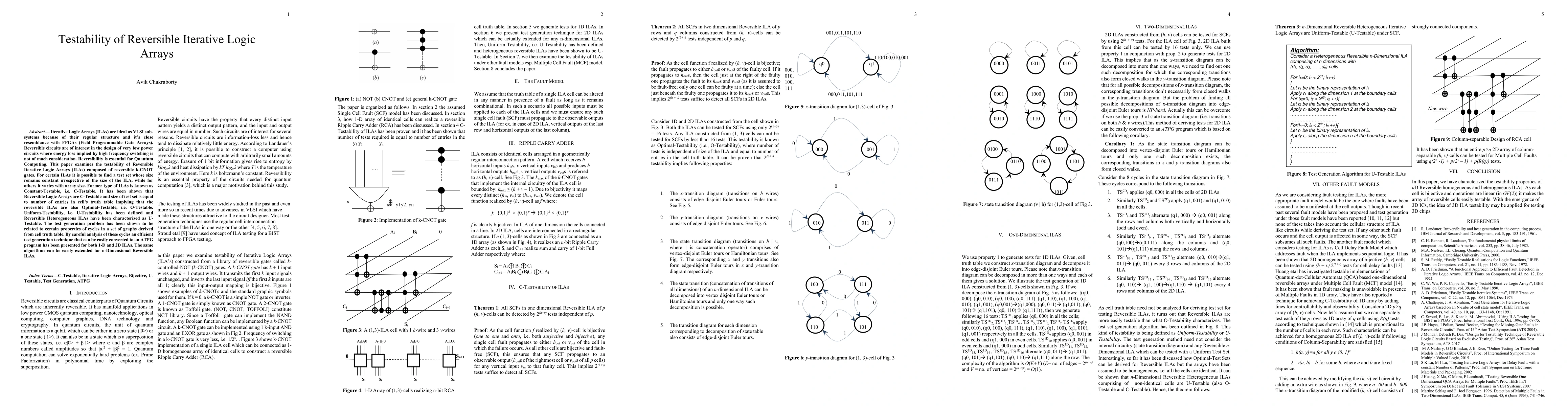 Iterative Logic Arrays (ILAs) are ideal as VLSI sub-systems because of their regular structure and its close resemblance with FPGAs (Field Programmable Gate Arrays). Reversible circuits are of interest in the design of very low power circuits where energy loss implied by high frequency switching is not of much consideration. Reversibility is essential for Quantum Computing. This paper examines the testability of Reversible Iterative Logic Arrays (ILAs) composed of reversible k-CNOT gates. For certain ILAs it is possible to find a test set whose size remains constant irrespective of the size of the ILA, while for others it varies with array size. Former type of ILAs is known as Constant-Testable, i.e. C-Testable. It has been shown that Reversible Logic Arrays are C-Testable and size of test set is equal to number of entries in cells truth table implying that the reversible ILAs are also Optimal-Testable, i.e. O-Testable. Uniform-Testability, i.e. U-Testability has been defined and Reversible Heterogeneous ILAs have been characterized as U-Testable. The test generation problem has been shown to be related to certain properties of cycles in a set of graphs derived from cell truth table. By careful analysis of these cycles an efficient test generation technique that can be easily converted to an ATPG program has been presented for both 1-D and 2D ILAs. The same algorithms can be easily extended for n-Dimensional Reversible ILAs.