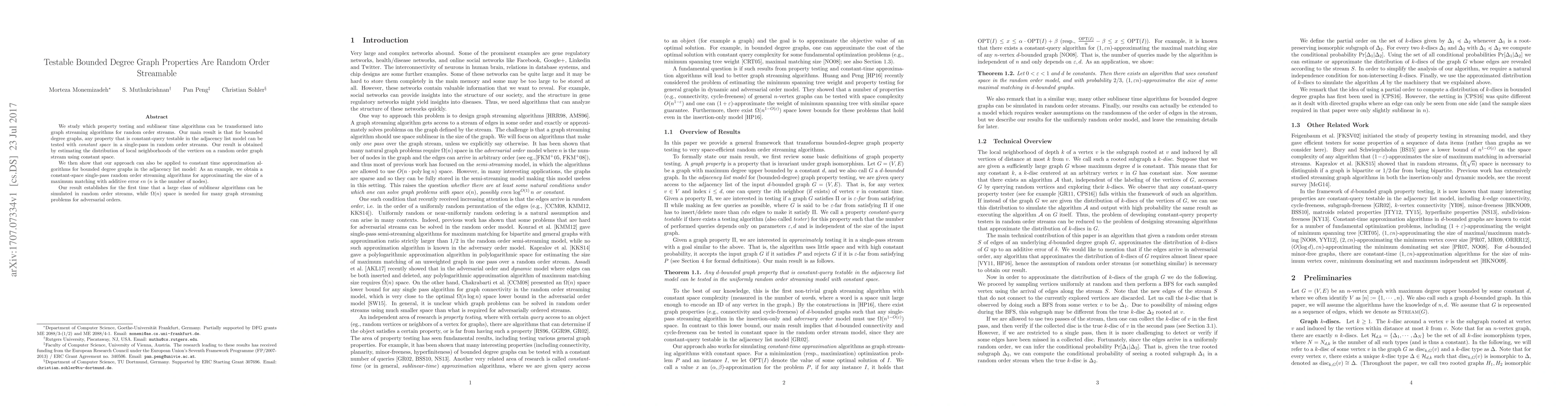The paper presents a technique to transform constant-query testable graph properties in the adjacency list model into constant-space testable properties in random order graph streams by approximating k-disc type distributions.