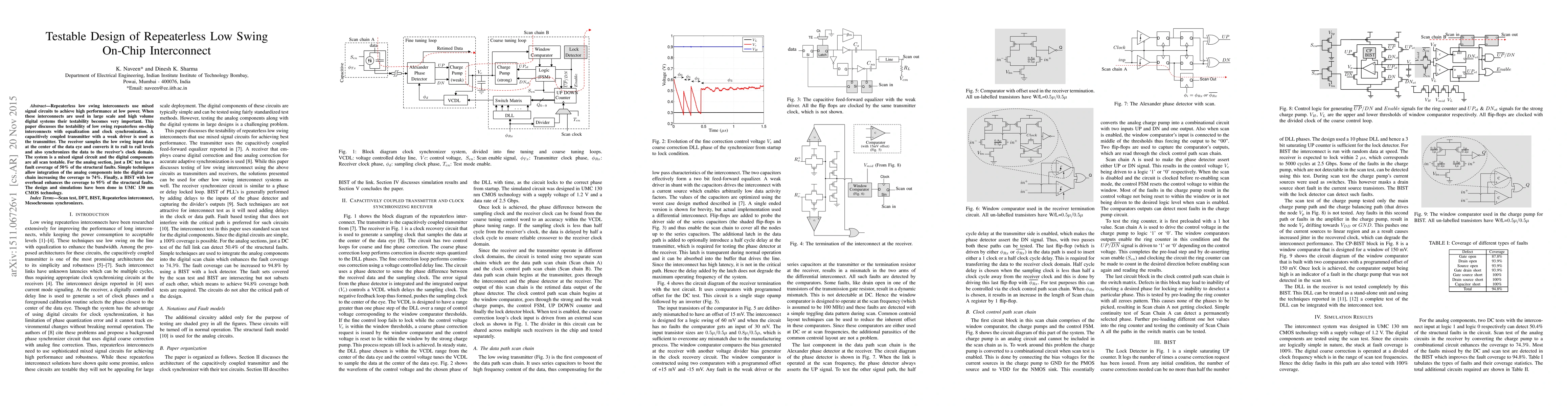 This paper explores the testability of repeaterless low swing on-chip interconnects using mixed signal circuits, achieving high performance with low power. The design integrates digital scan testability with enhanced analog fault coverage through a BIST, resulting in 95% structural fault coverage in UMC 130 nm CMOS technology.