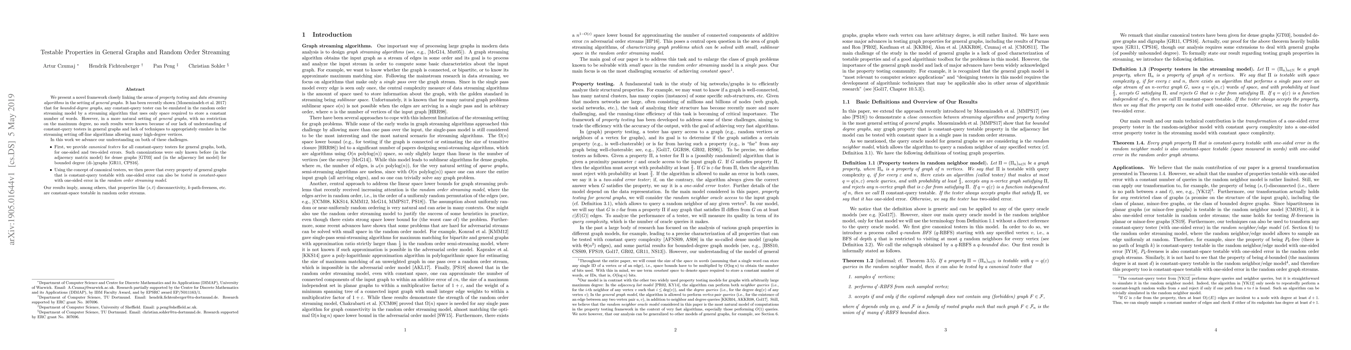 We present a novel framework closely linking the areas of property testing and data streaming algorithms in the setting of general graphs. It has been recently shown (Monemizadeh et al. 2017) that for bounded-degree graphs, any constant-query tester can be emulated in the random order streaming model by a streaming algorithm that uses only space required to store a constant number of words. However, in a more natural setting of general graphs, with no restriction on the maximum degree, no such results were known because of our lack of understanding of constant-query testers in general graphs and lack of techniques to appropriately emulate in the streaming setting off-line algorithms allowing many high-degree vertices. In this work we advance our understanding on both of these challenges. First, we provide canonical testers for all constant-query testers for general graphs, both, for one-sided and two-sided errors. Such canonizations were only known before (in the adjacency matrix model) for dense graphs (Goldreich and Trevisan 2003) and (in the adjacency list model) for bounded degree (di-)graphs (Goldreich and Ron 2011, Czumaj et al. 2016). Using the concept of canonical testers, we then prove that every property of general graphs that is constant-query testable with one-sided error can also be tested in constant-space with one-sided error in the random order streaming model. Our results imply, among others, that properties like $(s,t)$ disconnectivity, $k$-path-freeness, etc. are constant-space testable in random order streams.
