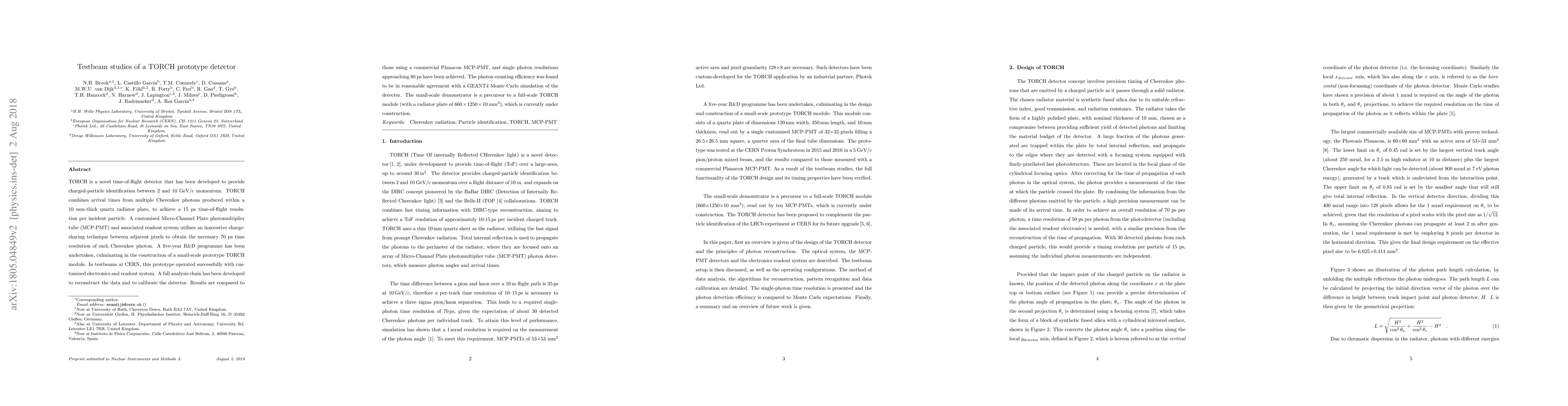 This paper details testbeam studies of a prototype TORCH detector designed for charged-particle identification, achieving a 15 ps time-of-flight resolution. The prototype, developed over five years, successfully operated at CERN, demonstrating photon counting efficiency and time resolution comparable to simulations.