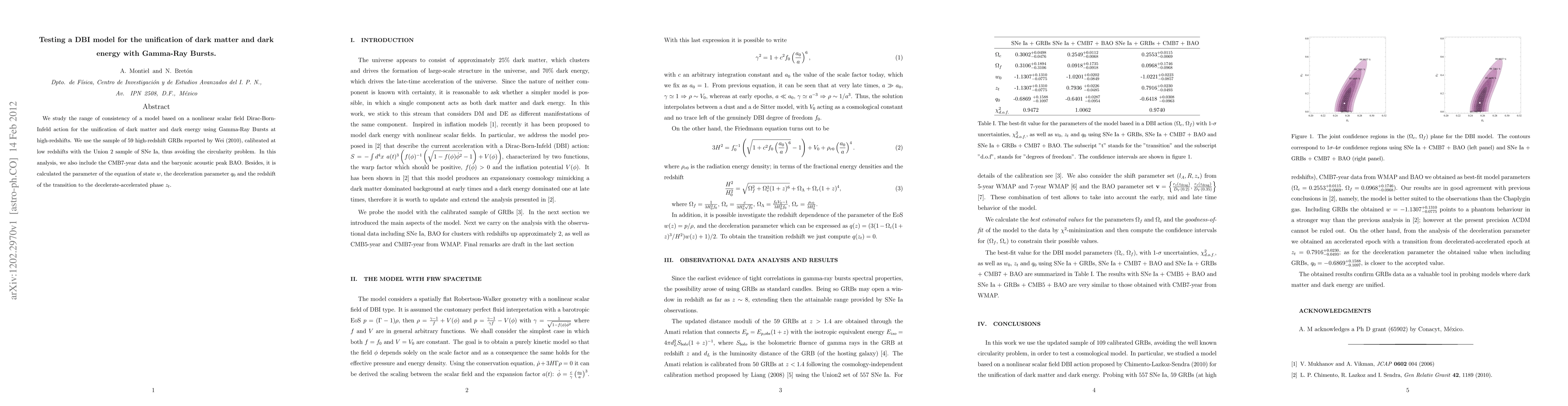 We study the range of consistency of a model based on a nonlinear scalar field Dirac-Born-Infeld action for the unification of dark matter and dark energy using Gamma-Ray Bursts at high-redshifts. We use the sample of 59 high-redshift GRBs reported by Wei (2010), calibrated at low redshifts with the Union 2 sample of SNe Ia, thus avoiding the circularity problem. In this analysis, we also include the CMB7-year data and the baryonic acoustic peak BAO. Besides, it is calculated the parameter of the equation of state $w$, the deceleration parameter $q_0$ and the redshift of the transition to the decelerate-accelerated phase $z_t$.