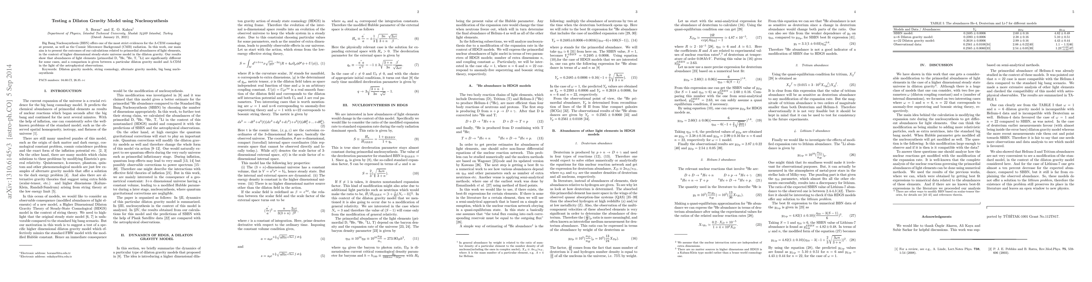 Big Bang Nucleosynthesis (BBN) offers one of the most strict evidences for the Lambda-CDM cosmology at present, as well as the Cosmic Microwave Background (CMB) radiation. In this work, our main aim is to present the outcomes of our calculations related to primordial abundances of light elements, in the context of higher dimensional steady-state universe model in the dilaton gravity. Our results show that abundances of light elements (primordial D, 3He, 4He, T, 7Li) are significantly different for some cases, and a comparison is given between a particular dilaton gravity model and Lambda-CDM in the light of the astrophysical observations.