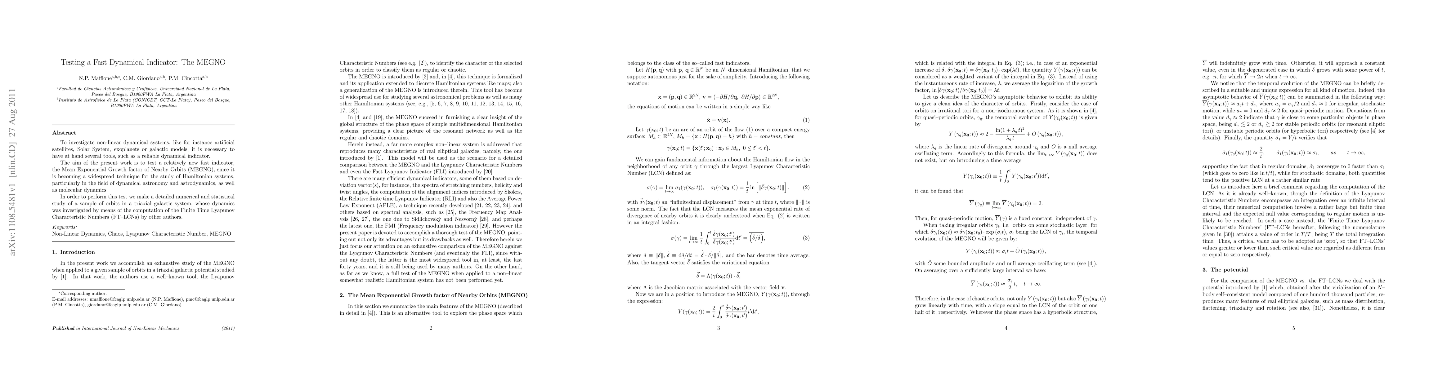 This paper tests the Mean Exponential Growth factor of Nearby Orbits (MEGNO) as a fast dynamical indicator for non-linear systems, using a detailed numerical and statistical study of orbits in a triaxial galactic system previously analyzed with Finite Time Lyapunov Characteristic Numbers (FT-LCNs). The study aims to validate MEGNO's effectiveness in Hamiltonian systems, particularly in dynamical astronomy and astrodynamics.