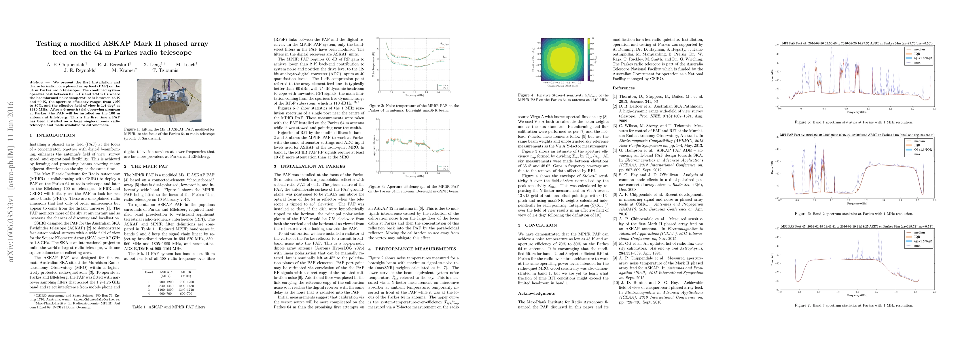 This paper details the first installation and performance of a phased array feed (PAF) on the 64 m Parkes radio telescope, achieving optimal results between 0.8 GHz and 1.74 GHz with noise temperatures of 45-60 K and aperture efficiencies of 70-80%. The PAF will later be installed on the 100 m Effelsberg antenna.