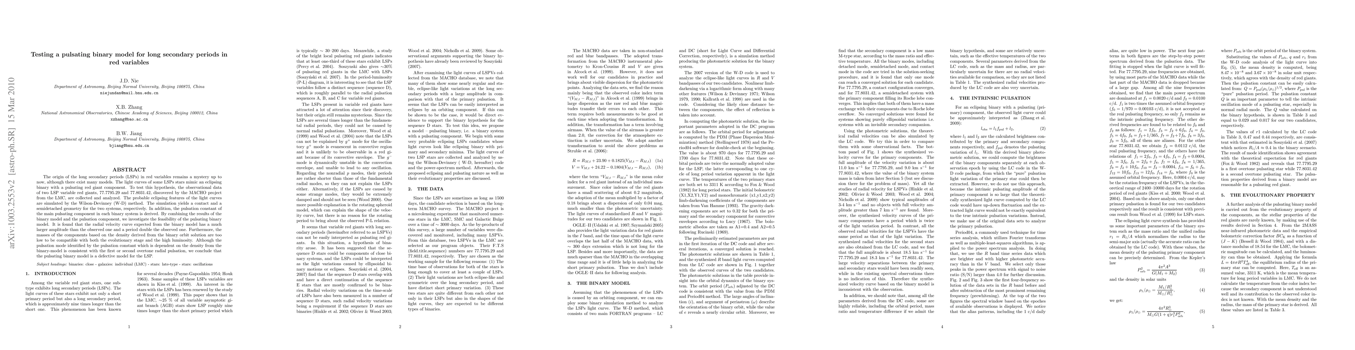 The study tests a pulsating binary model for long secondary periods (LSPs) in red variables, analyzing data from two LSP variable red giants. The results suggest that the model's predicted radial velocity curve and component masses do not match observations, concluding that the pulsating binary model is not feasible for explaining LSPs.