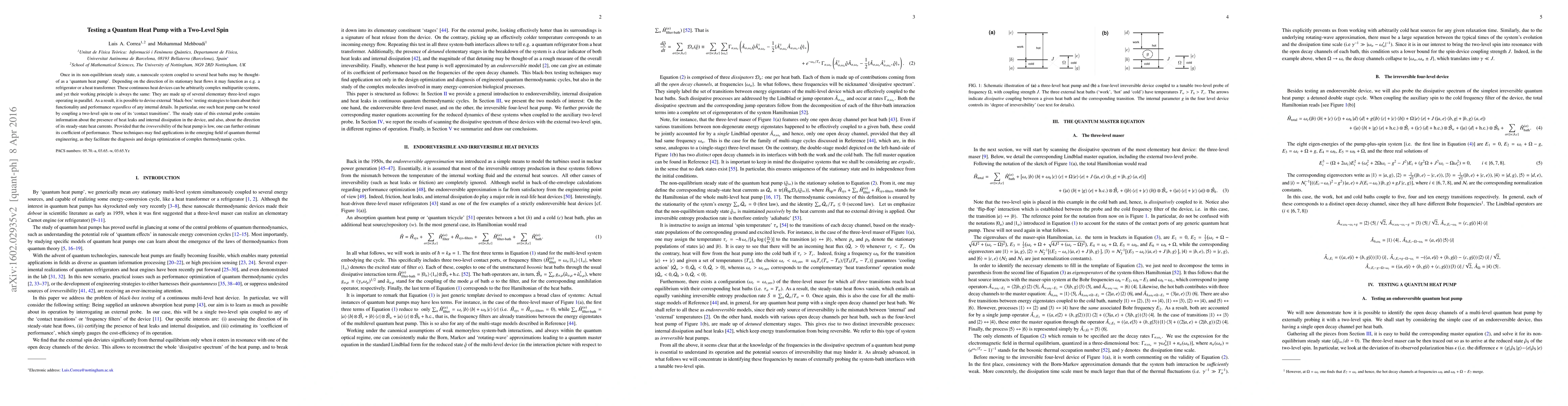 This paper explores testing a quantum heat pump using a two-level spin as an external probe, revealing information about heat leaks, internal dissipation, and the direction of heat currents. Low irreversibility allows estimation of the heat pump's coefficient of performance, aiding in the diagnosis and optimization of quantum thermal engineering systems.