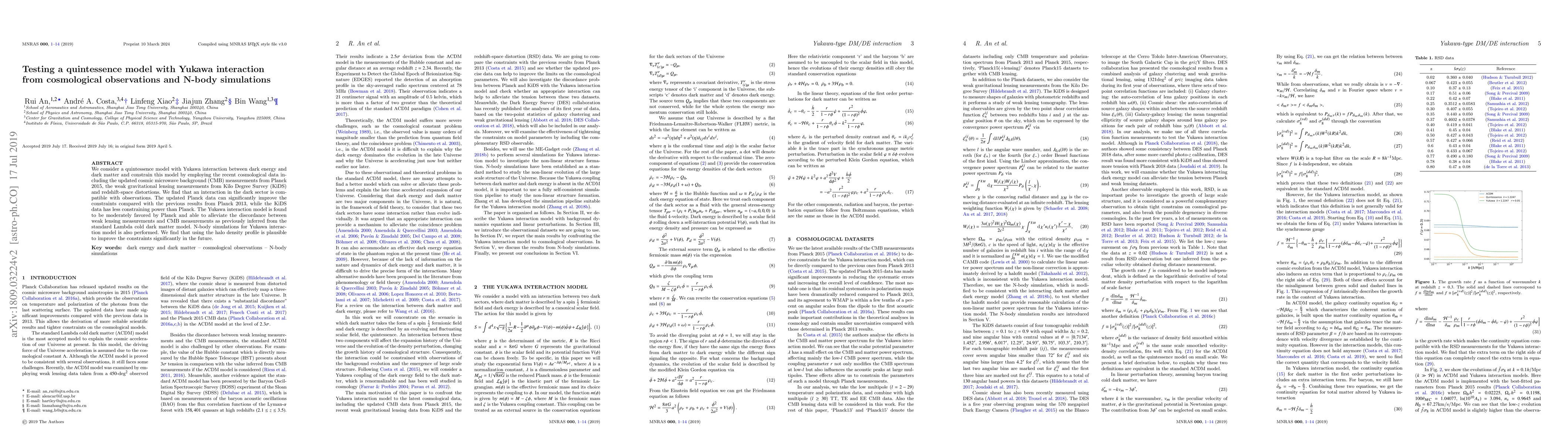 A study tests a quintessence model with Yukawa interaction between dark energy and dark matter, finding it compatible with recent cosmological observations, including CMB, lensing, and redshift-space distortions.