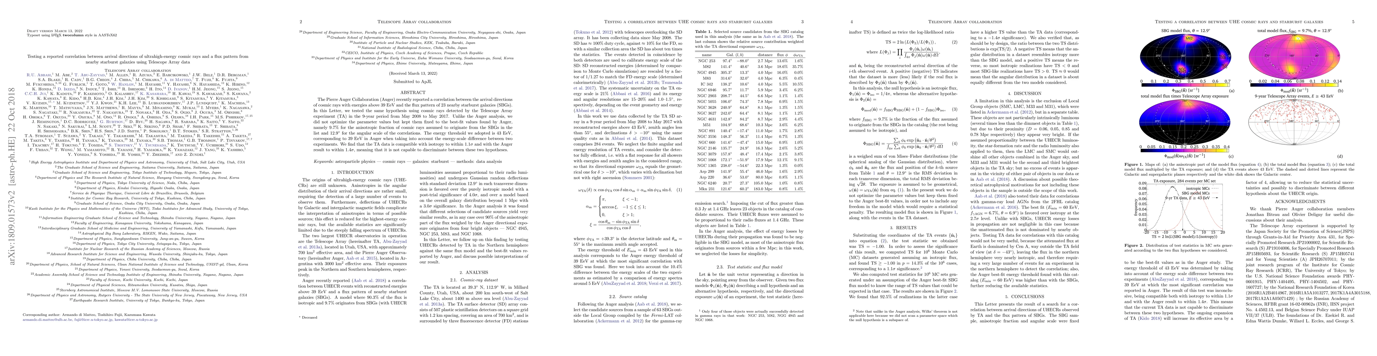 This paper tests the correlation between ultrahigh-energy cosmic rays' arrival directions and nearby starburst galaxies using Telescope Array data, finding compatibility with isotropy and the Auger Collaboration's results within 1.1σ and 1.4σ respectively, thus unable to distinguish between the two hypotheses.