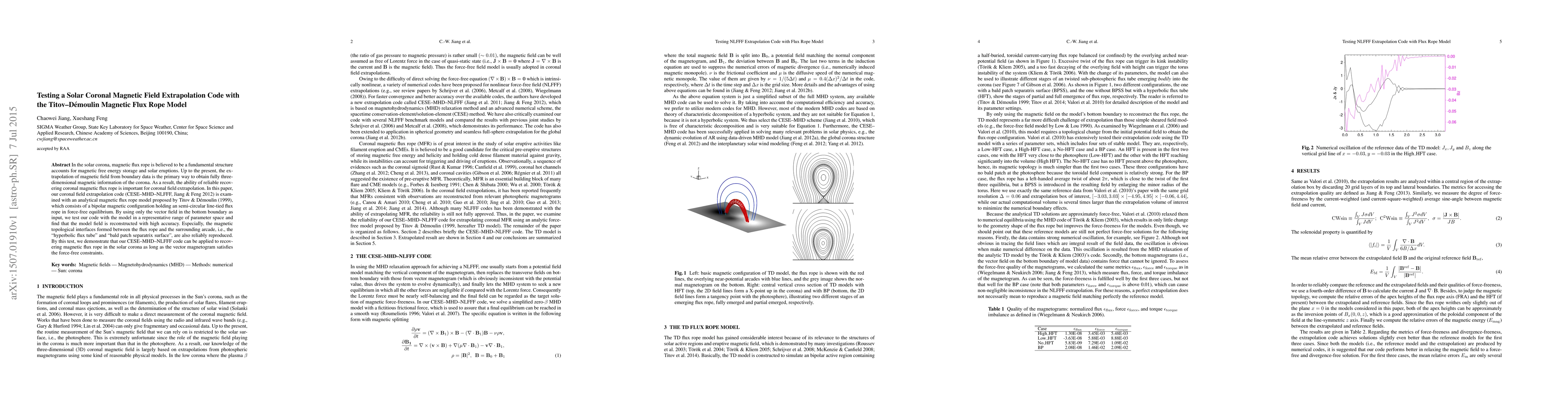 This paper tests a coronal magnetic field extrapolation code (CESE-MHD-NLFFF) using the Titov-Demoulin magnetic flux rope model to assess its ability to reconstruct three-dimensional magnetic structures in the solar corona. The results show high accuracy in reconstructing the model field and magnetic topological interfaces, demonstrating the code's potential for analyzing solar magnetic flux ropes.