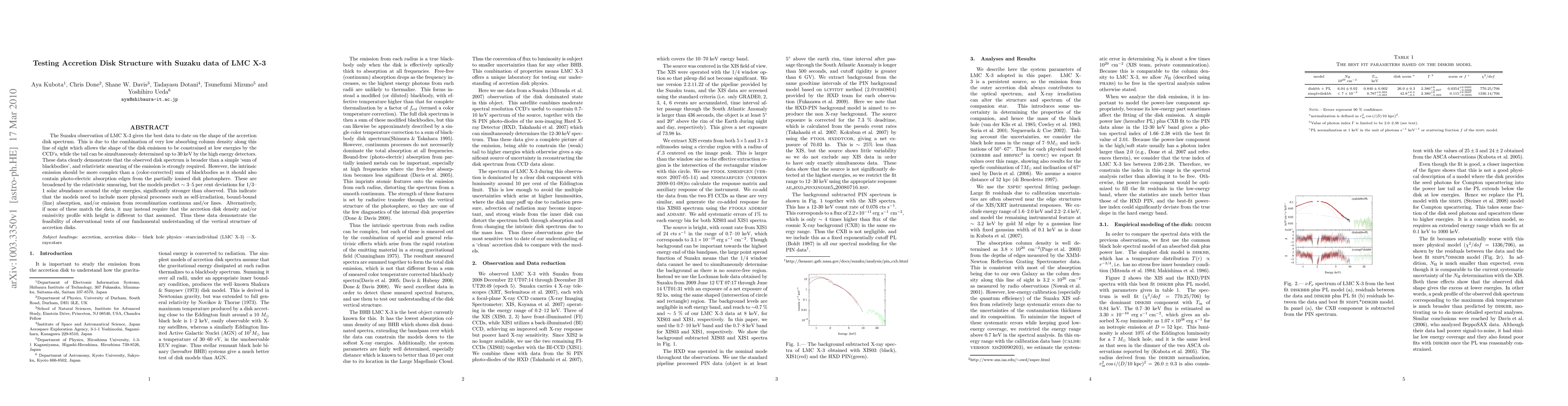 The Suzaku observation of LMC X-3 gives the best data to date on the shape of the accretion disk spectrum. This is due to the combination of very low absorbing column density along this line of sight which allows the shape of the disk emisison to be constrained at low energies by the CCD's, while the tail can be simultaneously determined up to 30 keV by the high energy detectors. These data clearly demonstrate that the observed disk spectrum is broader than a simple 'sum of blackbodies', and relativistic smearing of the emission is strongly required. However, the intrinsic emission should be more complex than a (color-corrected) sum of blackbodies as it should also contain photo-electric absorption edges from the partially ionised disk photosphere. These are broadened by the relativistic smearing, but the models predict ~ 3-5 per cent deviations for 1/3- 1 solar abundance around the edge energies, significantly stronger than observed. This indicate that the models need to include more physical processes such as self-irradiation, bound-bound (line) absorption, and/or emission from recombination continuua and/or lines. Alternatively, if none of these match the data, it may instead require that the accretion disk density and/or emissivity profile with height is different to that assumed. Thus these data demonstrate the feasibility of observational tests of our fundamental understanding of the vertical structure of accretion disks.