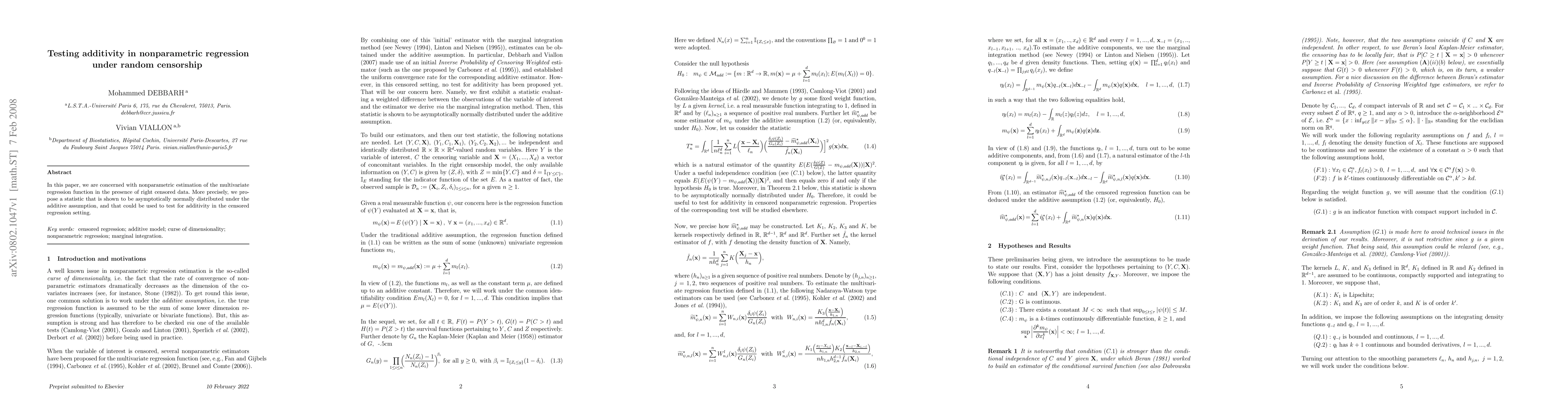 This paper proposes a statistic for testing additivity in nonparametric regression under right censored data, demonstrating its asymptotic normality under the additive assumption. The method aims to provide a tool for assessing additivity in censored regression settings.