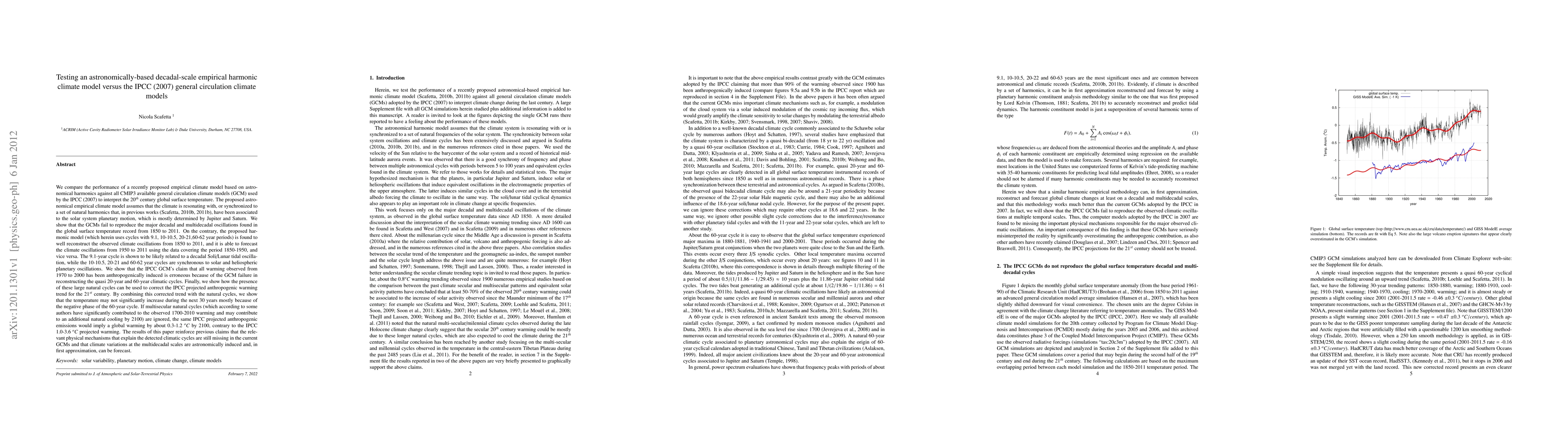 This paper compares an astronomically-based empirical harmonic climate model against IPCC (2007) GCMs, finding that the harmonic model better reconstructs and forecasts decadal climate oscillations from 1850-2011. It suggests that the model's success indicates missing physical mechanisms in GCMs and proposes that natural astronomical cycles may mitigate projected anthropogenic warming.