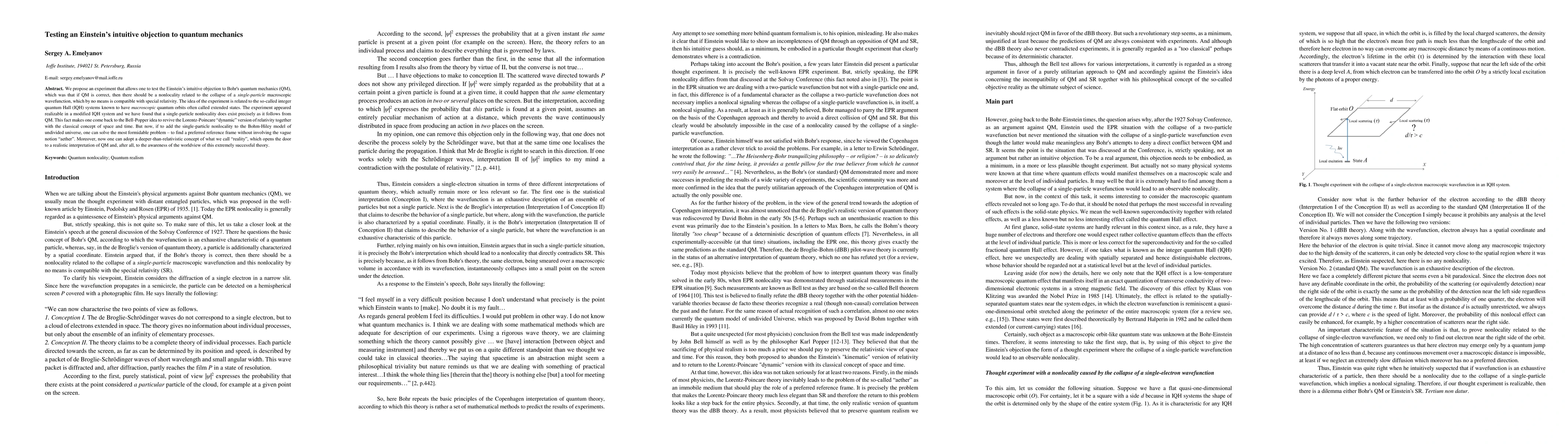 We propose an experiment that allows one to test the Einstein's intuitive objection to Bohr's quantum mechanics (QM), which was that if QM is correct, then there should be a nonlocality related to the collapse of a single-particle macroscopic wavefunction, which by no means is compatible with special relativity. The idea of the experiment is related to the so-called integer quantum Hall (IQH) systems known to have macroscopic quantum orbits often called extended states. The experiment appeared realizable in a modified IQH system and we have found that a single-particle nonlocality does exist precisely as it follows from QM. This fact makes one come back to the Bell-Popper idea to revive the Lorentz-Poincare "dynamic" version of relativity together with the classical concept of space and time. But now, if to add the single-particle nonlocality to the Bohm-Hiley model of undivided universe, one can solve the most formidable problem - to find a preferred reference frame without involving the vague notion "aether". Moreover, now one can adopt a deeper-than-relativistic concept of what we call "reality", which opens the door to a realistic interpretation of QM and, after all, to the awareness of the worldview of this extremely successful theory.