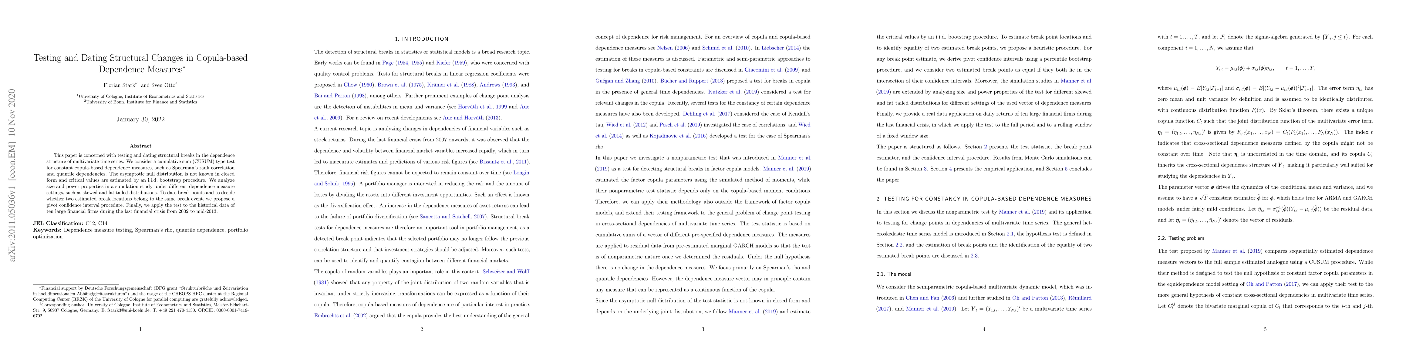 This paper is concerned with testing and dating structural breaks in the dependence structure of multivariate time series. We consider a cumulative sum (CUSUM) type test for constant copula-based dependence measures, such as Spearman's rank correlation and quantile dependencies. The asymptotic null distribution is not known in closed form and critical values are estimated by an i.i.d. bootstrap procedure. We analyze size and power properties in a simulation study under different dependence measure settings, such as skewed and fat-tailed distributions. To date break points and to decide whether two estimated break locations belong to the same break event, we propose a pivot confidence interval procedure. Finally, we apply the test to the historical data of ten large financial firms during the last financial crisis from 2002 to mid-2013.