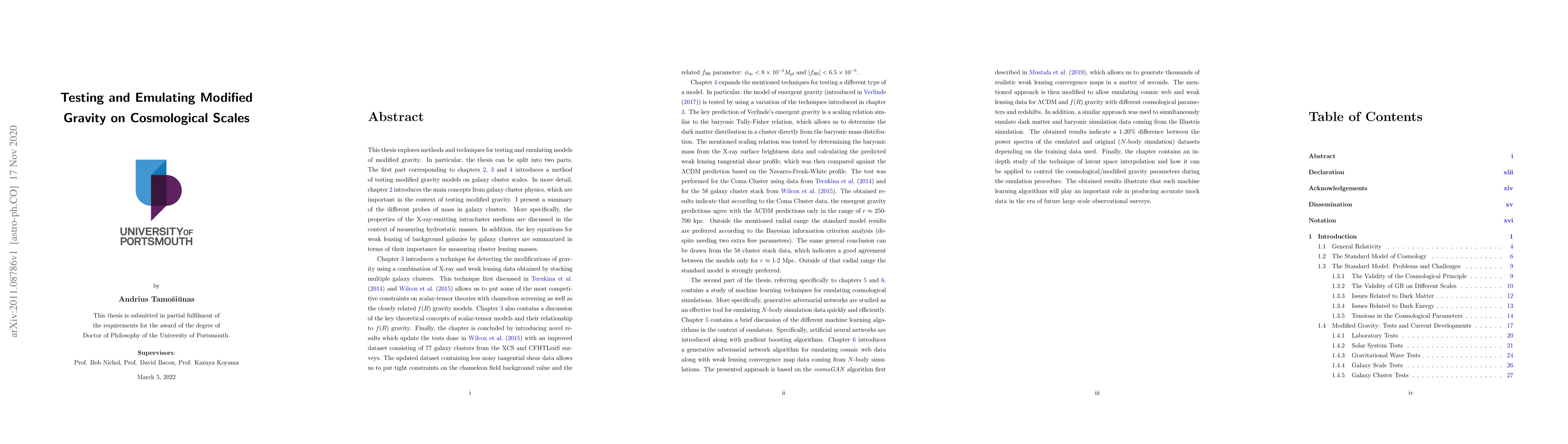 This research introduces methods for testing models of modified gravity using galaxy clusters, including a technique for constraining chameleon-screened models and extending it to a broader class of theories like emergent gravity. It also presents a machine learning approach using Generative Adversarial Networks (GANs) to emulate cosmological N-body simulation data for dark matter-only and hydrodynamical simulations, as well as modified gravity N-body simulations.