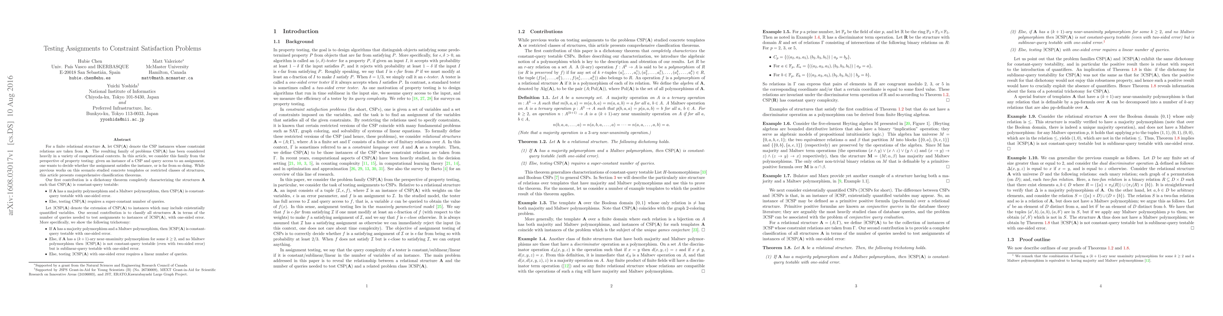 For a finite relational structure A, let CSP(A) denote the CSP instances whose constraint relations are taken from A. The resulting family of problems CSP(A) has been considered heavily in a variety of computational contexts. In this article, we consider this family from the perspective of property testing: given an instance of a CSP and query access to an assignment, one wants to decide whether the assignment satisfies the instance, or is far from so doing. While previous works on this scenario studied concrete templates or restricted classes of structures, this article presents comprehensive classification theorems. Our first contribution is a dichotomy theorem completely characterizing the structures A such that CSP(A) is constant-query testable: (i) If A has a majority polymorphism and a Maltsev polymorphism, then CSP(A) is constant-query testable with one-sided error. (ii) Else, testing CSP(A) requires a super-constant number of queries. Let $\exists$CSP(A) denote the extension of CSP(A) to instances which may include existentially quantified variables. Our second contribution is to classify all structures A in terms of the number of queries needed to test assignments to instances of $\exists$CSP(A), with one-sided error. More specifically, we show the following trichotomy: (i) If A has a majority polymorphism and a Maltsev polymorphism, then $\exists$CSP(A) is constant-query testable with one-sided error. (ii) Else, if A has a $(k + 1)$-ary near-unanimity polymorphism for some $k \geq 2$, and no Maltsev polymorphism then $\exists$CSP(A) is not constant-query testable (even with two-sided error) but is sublinear-query testable with one-sided error. (iii) Else, testing $\exists$CSP(A) with one-sided error requires a linear number of queries.