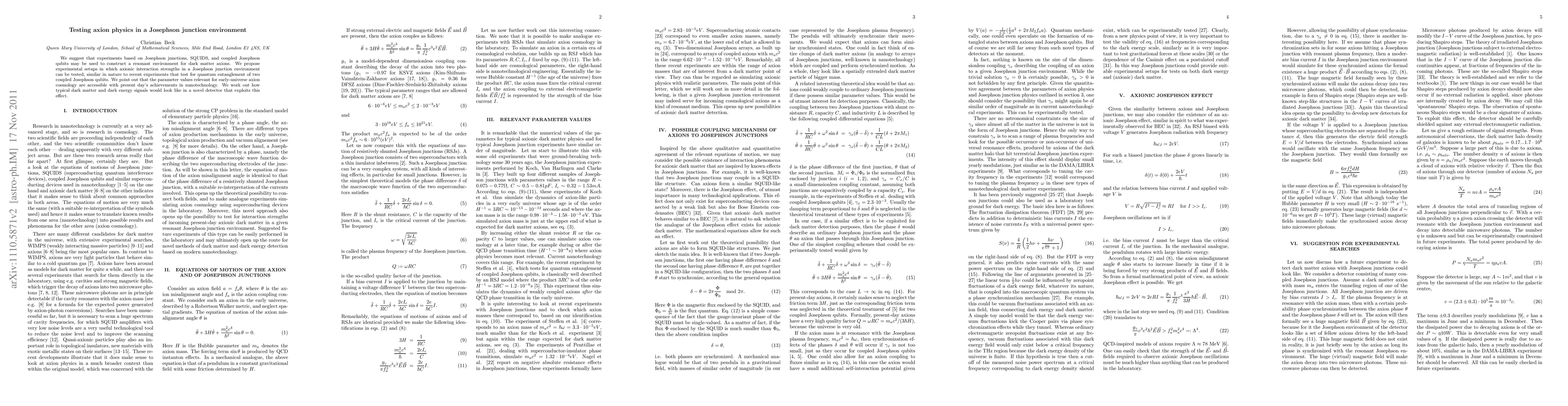 This paper proposes using Josephson junctions and coupled qubits to create a resonant environment for detecting axions, a potential dark matter candidate. It outlines experimental setups to test axionic interactions, leveraging current nanotechnology advancements to explore parameter values relevant to early-universe axion cosmology.