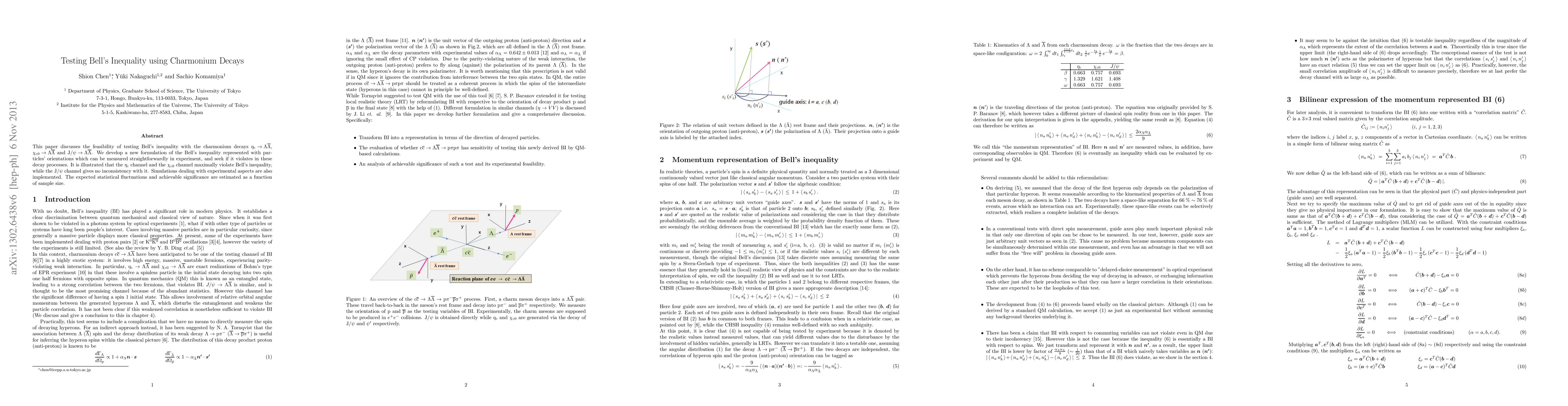 This paper explores testing Bell's inequality using charmonium decays, specifically \eta_c, \chi_{c0}, and J/\Psi, with a new formulation based on measurable particle momenta. Results show that \eta_c and \chi_{c0} channels maximally violate Bell's inequality, while the J/\Psi channel does not, with simulations assessing experimental feasibility and statistical significance.