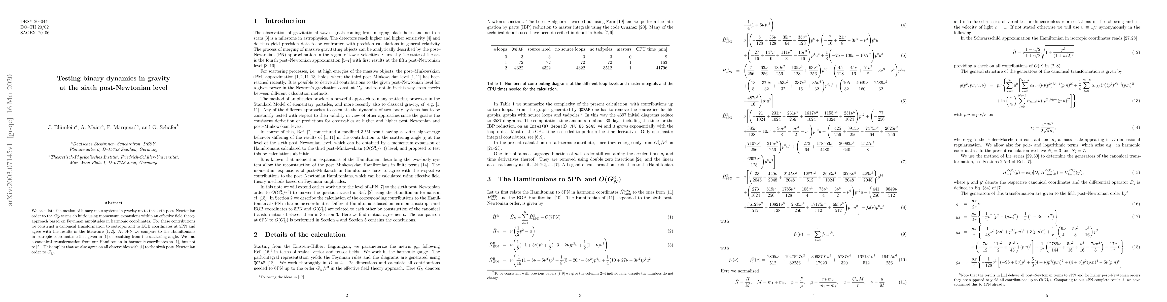We calculate the motion of binary mass systems in gravity up to the sixth post--Newtonian order to the $G_N^3$ terms ab initio using momentum expansions within an effective field theory approach based on Feynman amplitudes in harmonic coordinates. For these contributions we construct a canonical transformation to isotropic and to EOB coordinates at 5PN and agree with the results in the literature \cite{Bern:2019nnu,Damour:2019lcq}. At 6PN we compare to the Hamiltonians in isotropic coordinates either given in \cite{Bern:2019nnu} or resulting from the scattering angle. We find a canonical transformation from our Hamiltonian in harmonic coordinates to \cite{Bern:2019nnu}, but not to \cite{Damour:2019lcq}. This implies that we also agree on all observables with \cite{Bern:2019nnu} to the sixth post--Newtonian order to $G_N^3$.