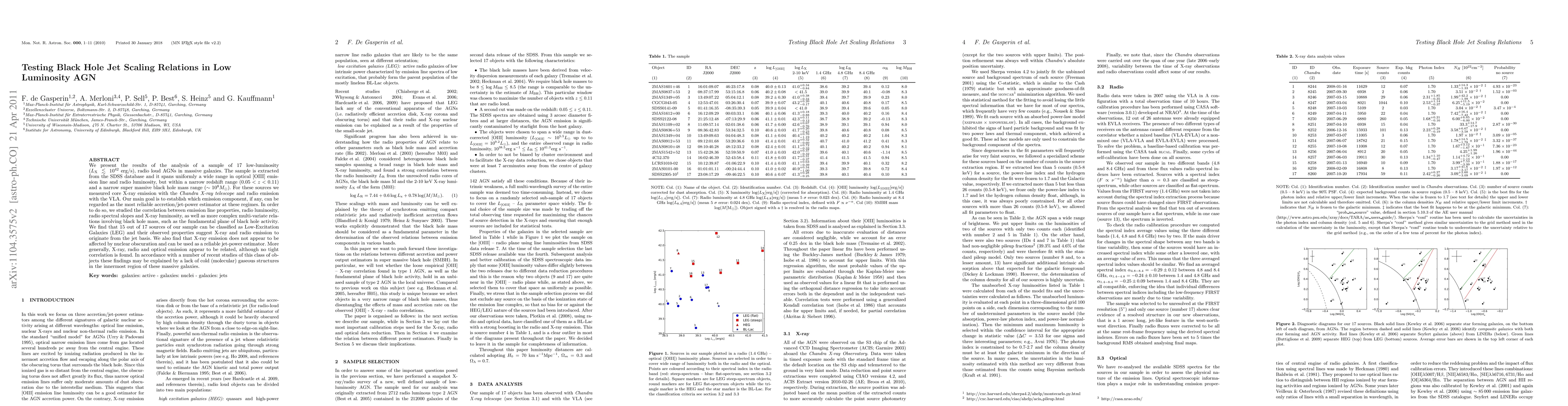 We present the results of the analysis of a sample of 17 low-luminosity (L_x < 1e42 erg/s), radio loud AGNs in massive galaxies. The sample is extracted from the SDSS database and it spans uniformly a wide range in optical [OIII] emission line and radio luminosity, but within a narrow redshift range (0.05 < z < 0.11) and a narrow super massive black hole mass range (~ 1e8 M_sun). For these sources we measured core X-ray emission with the Chandra X-ray telescope and radio emission with the VLA. Our main goal is to establish which emission component, if any, can be regarded as the most reliable accretion/jet-power estimator at these regimes. In order to do so, we studied the correlation between emission line properties, radio luminosity, radio spectral slopes and X-ray luminosity, as well as more complex multi-variate relations involving black hole mass, such as the fundamental plane of black hole activity. We find that 15 out of 17 sources of our sample can be classified as Low-Excitation Galaxies (LEG) and their observed properties suggest X-ray and radio emission to originate from the jet basis. We also find that X-ray emission does not appear to be affected by nuclear obscuration and can be used as a reliable jet-power estimator. More generally, X-ray, radio and optical emission appear to be related, although no tight correlation is found. In accordance with a number of recent studies of this class of objects these findings may be explained by a lack of cold (molecular) gaseous structures in the innermost region of these massive galaxies.