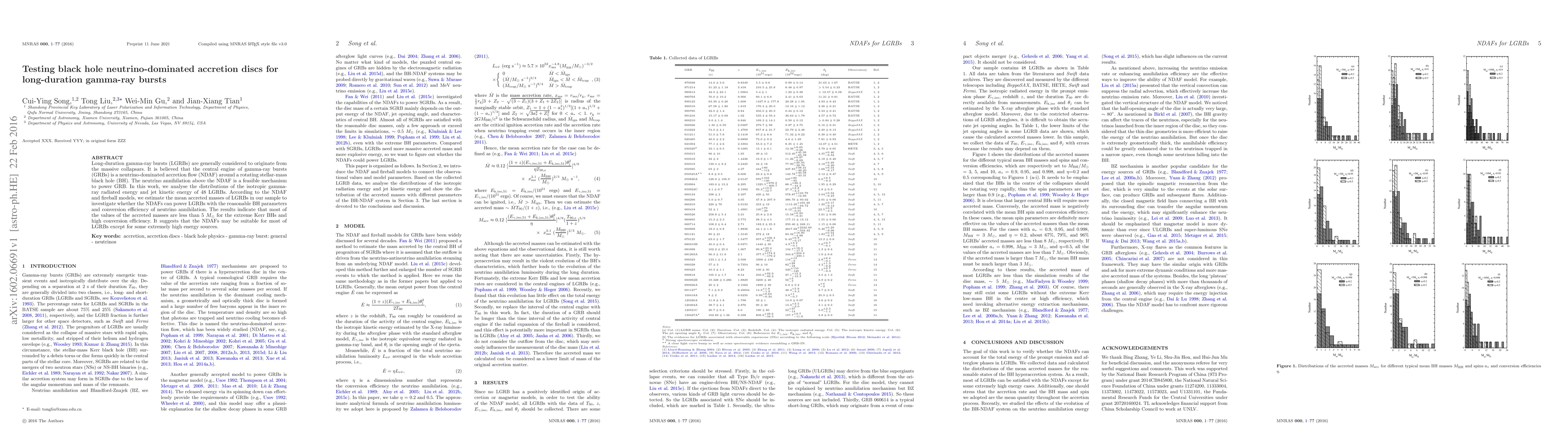 Long-duration gamma-ray bursts (LGRBs) are generally considered to originate from the massive collapsars. It is believed that the central engine of gamma-ray bursts (GRBs) is a neutrino-dominated accretion flow (NDAF) around a rotating stellar-mass black hole (BH). The neutrino annihilation above the NDAF is a feasible mechanism to power GRB. In this work, we analyse the distributions of the isotropic gamma-ray radiated energy and jet kinetic energy of 48 LGRBs. According to the NDAF and fireball models, we estimate the mean accreted masses of LGRBs in our sample to investigate whether the NDAFs can power LGRBs with the reasonable BH parameters and conversion efficiency of neutrino annihilation. The results indicate that most of the values of the accreted masses are less than $5~M_\odot$ for the extreme Kerr BHs and high conversion efficiency. It suggests that the NDAFs may be suitable for most of LGRBs except for some extremely high energy sources.