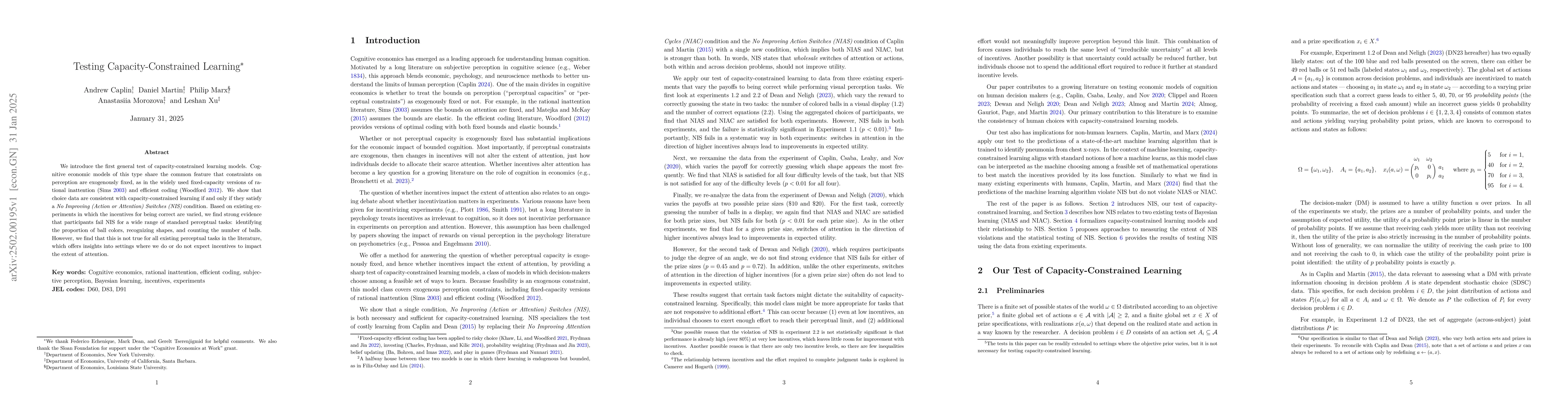 We introduce the first general test of capacity-constrained learning models. Cognitive economic models of this type share the common feature that constraints on perception are exogenously fixed, as in the widely used fixed-capacity versions of rational inattention (Sims 2003) and efficient coding (Woodford 2012). We show that choice data are consistent with capacity-constrained learning if and only if they satisfy a No Improving (Action or Attention) Switches (NIS) condition. Based on existing experiments in which the incentives for being correct are varied, we find strong evidence that participants fail NIS for a wide range of standard perceptual tasks: identifying the proportion of ball colors, recognizing shapes, and counting the number of balls. However, we find that this is not true for all existing perceptual tasks in the literature, which offers insights into settings where we do or do not expect incentives to impact the extent of attention.