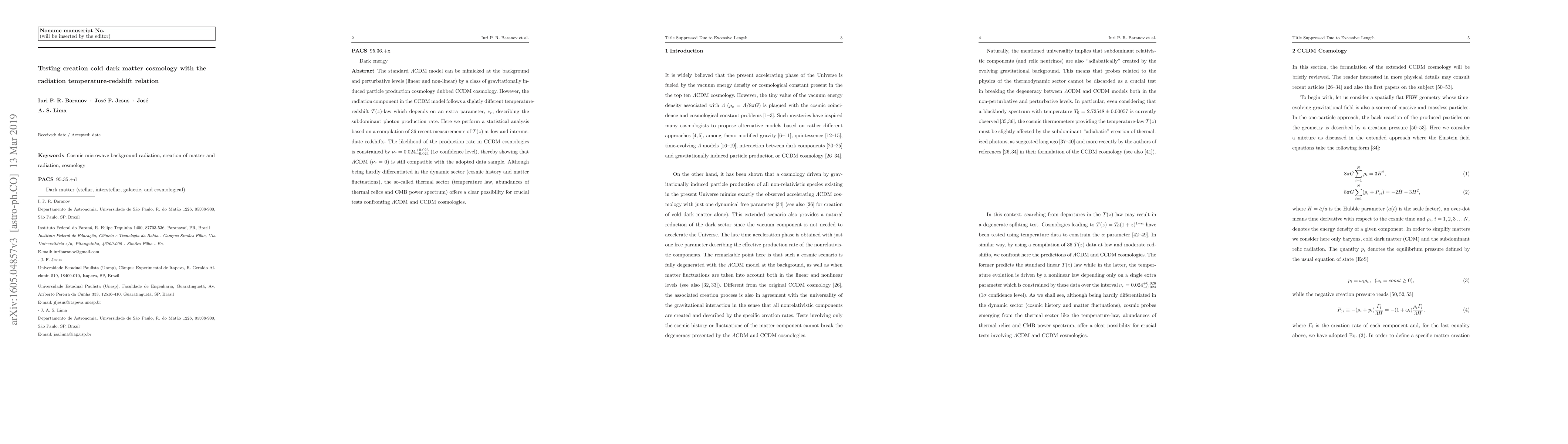 This paper tests CCDM cosmology against the $\Lambda$CDM model using the radiation temperature-redshift relation. Statistical analysis of 36 $T(z)$ measurements finds $\nu_r = 0.024^{+0.026}_{-0.024}$, indicating $\Lambda$CDM remains compatible, though the thermal sector may provide future tests to distinguish between the two models.