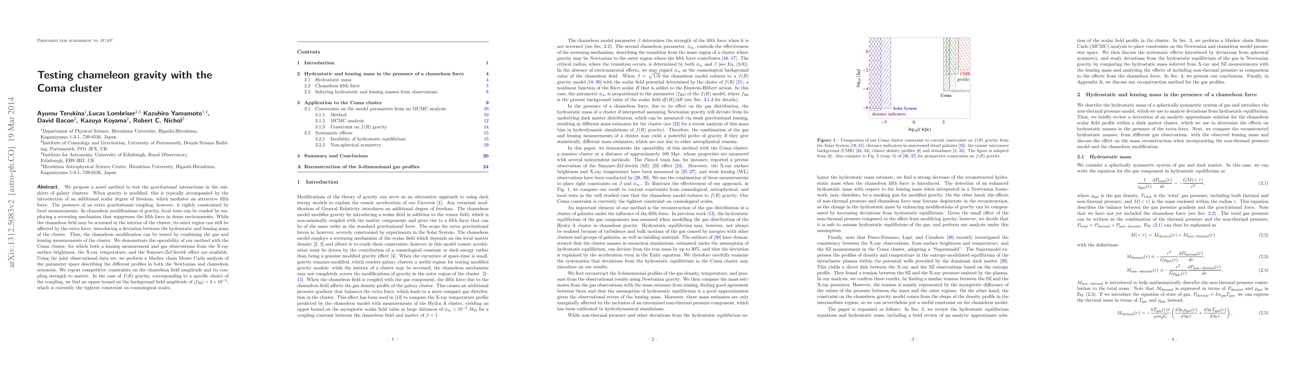 This paper proposes a novel method to test chameleon gravity by examining deviations in the mass distribution of the Coma cluster, combining gas and lensing measurements. The study finds competitive constraints on the chameleon field, reporting the tightest upper bound on the background field amplitude for f(R) gravity at |f_{R0}|<6*10^{-5} on cosmological scales.