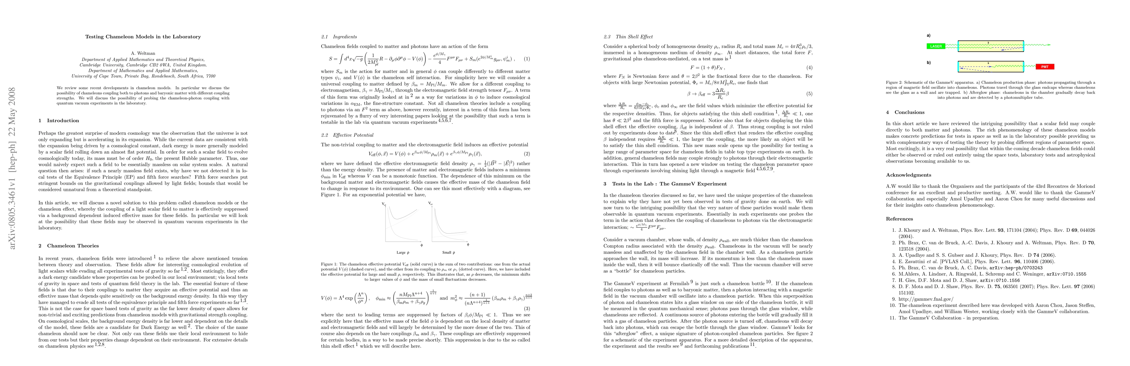 Summary: This paper reviews recent advancements in chameleon models, focusing on the potential for chameleons to couple with both photons and baryonic matter at different strengths. It explores the feasibility of detecting chameleon-photon interactions through laboratory-based quantum vacuum experiments.