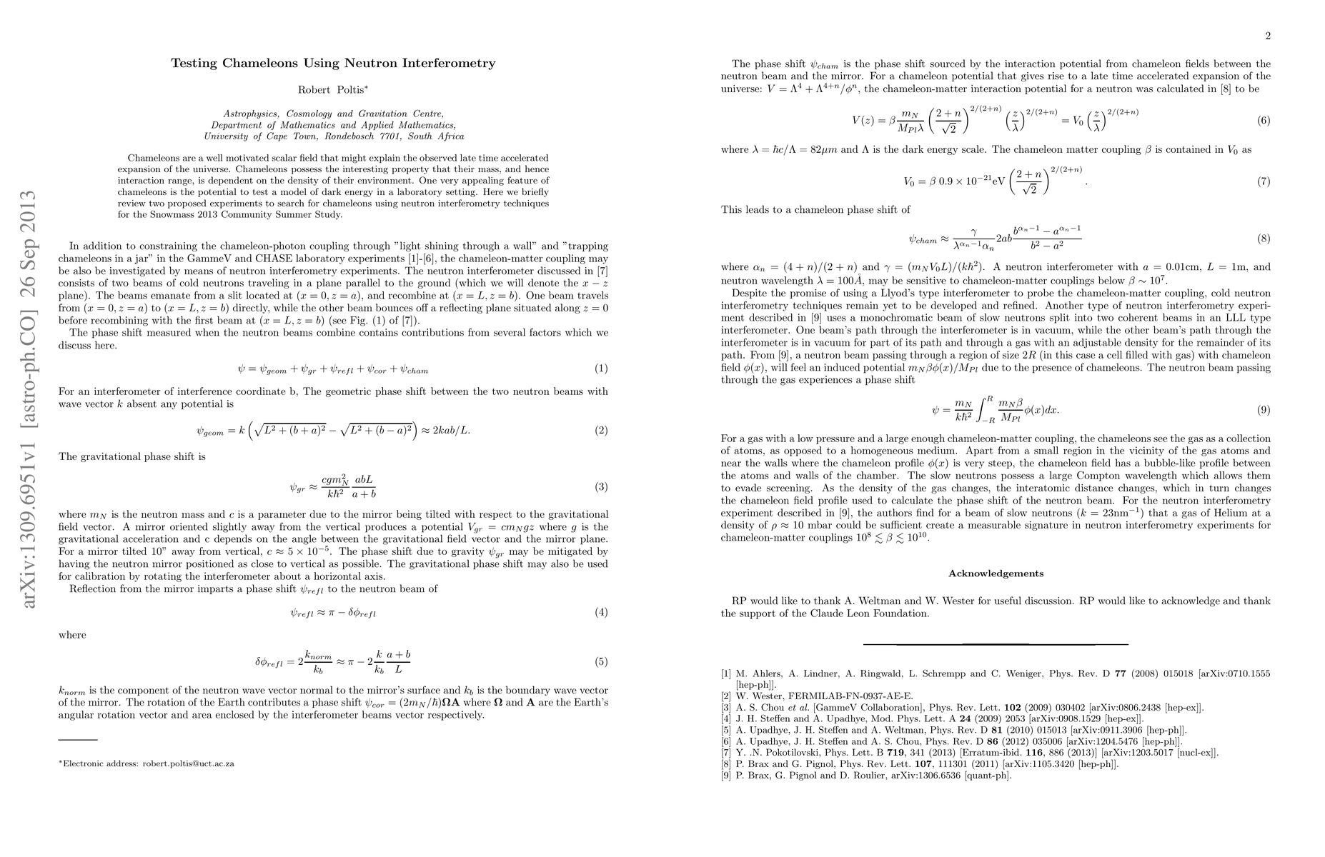 This paper reviews two proposed experiments using neutron interferometry to detect chameleons, a scalar field that could explain dark energy and whose properties vary with environmental density. The experiments aim to test this model in a laboratory setting for the Snowmass 2013 Community Summer Study.